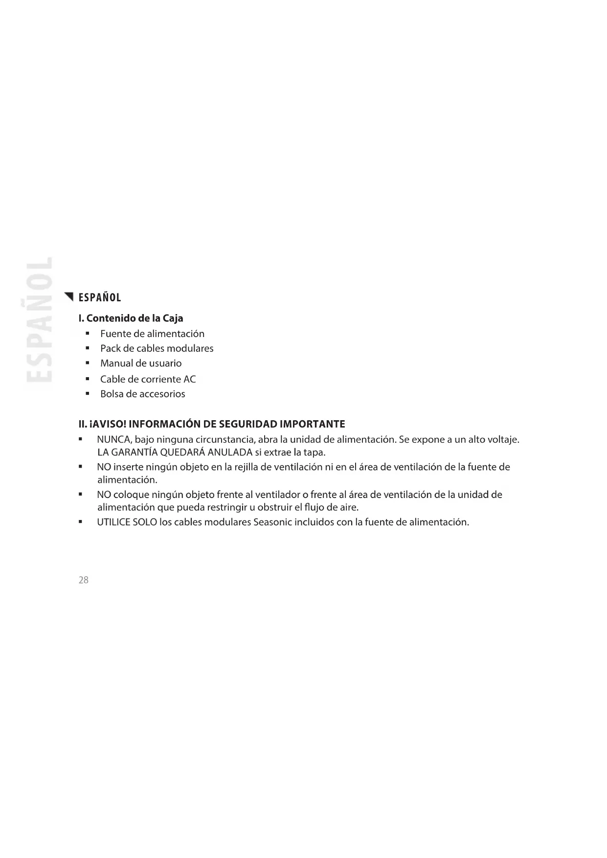 NUNCA, bajo ninguna circunstancia, abra la unidad de alimentación. Se expone a un alto voltaje. LA GARANTÍA QUEDARÁ ANULADA si extrae la tapa. NO inserte ningún objeto en la rejilla de ventilación ni en el área de ventilación de la fuente de alimentación. NO coloque ningún objeto frente al ventilador o frente al área de ventilación de la unidad de alimentación que pueda restringir u obstruir el ujo de aire. UTILICE SOLO los cables modulares Seasonic incluidos con la fuente de alimentación. ESPAÑOL ESPAÑOL29 Mantenga la fuente de alimentación en un ambiente seco y alejado de humedades. Esta unidad de alimentación ha sido diseñada para ser integrada en un equipo informático, y no es apta para uso externo o al aire libre.