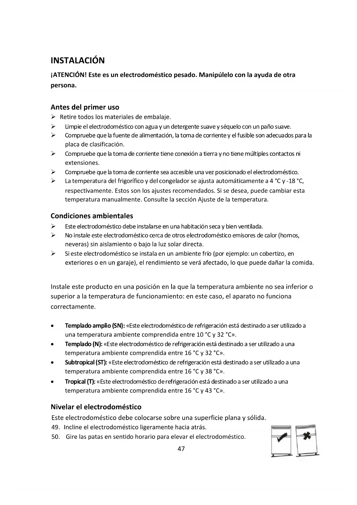 - Tropical (T): «Este electrodoméstico de refrigeración está destinado a ser utilizado a una temperatura ambiente comprendida entre 16 °C y 43 °C». Nivelar el electrodoméstico Este electrodoméstico debe colocarse sobre una superficie plana y sólida.