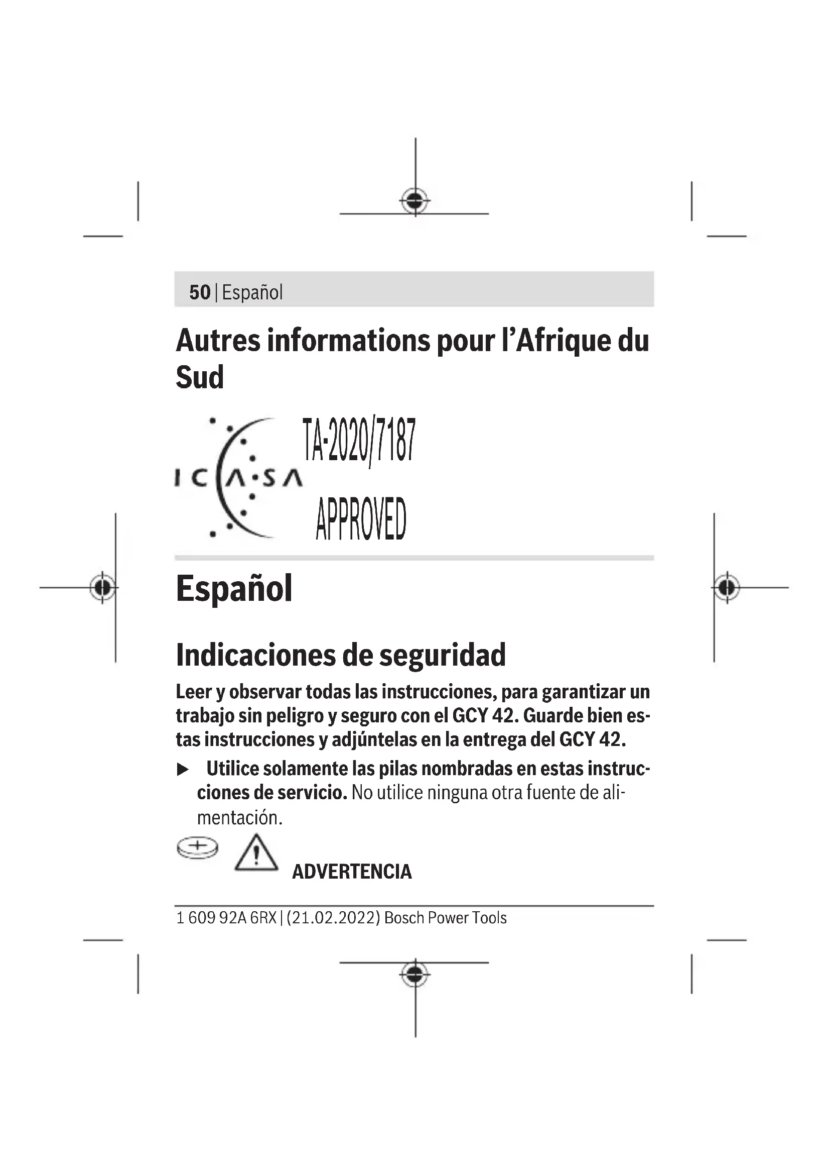 El alcance puede variar fuertemente según las condicio- nes exteriores, inclusive el receptor utilizado. En el inte- rior de espacios cerrados y por barreras metálicas (p. ej. paredes, estanterías, maletas, etc.), el alcance de Bluetooth® puede ser notoriamente menor. Bosch Power Tools 1 609 92A 6RX | (21.02.2022)56 | Español Requisitos del sistema GCY 42 Aparato final móvil (tablet, teléfono inteligente) Android 6.0 (y superior) iOS 11 (y superior) Montaje y operación Suministro de corriente u Quite la cubierta del módulo Bluetooth® Low Energy Mo- dule GCY 42 de la herramienta eléctrica, p. ej. con un destornillador o una moneda grande. Mediante la aplica- ción de objetos inadecuados, se puede dañar la electrónica o la cubierta. – Para la puesta en servicio tras la compra o cambiar la pila (1) siga las representaciones de las páginas gráficas. Ob- serve en ello las siguientes indicaciones. Primera puesta en marcha (ver figuras A1–A5) Indicación: Conserve adecuadamente el comodín (3) del GCY42. Coloque de nuevo el comodín para la transmisión de la herramienta eléctrica sin GCY 42. 1 609 92A 6RX | (21.02.2022) Bosch Power ToolsEspañol | 57 Coloque la pila (1) con el polo positivo hacia arriba en el GCY 42 (2) . No es necesario introducir a presión la pila; la pila no encastra por sí sola. Se fija solo cuando se cierra la tapa en la posición deseada. Para inicializar el GCY42 tras la colocación, accione el inte- rruptor de conexión/desconexión de la herramienta eléctrica. Cambio de batería (ver figuras B1–B4) Retire la pila usada (1) solamente con los dedos. Antes que se consuma completamente la pila, se indica una advertencia en la aplicación App. Retirar el GCY 42 (ver figuras C1–C2) No aplique violencia al retirar el GCY42 (2). No utilice herra- mientas puntiagudas o afiladas. Indicación: Gire eventualmente la herramienta eléctrica, para facilitar la salida del GCY42. Puesta en marcha Una vez que se ha colocado la pila (1) y se acciona el interrup- tor de conexión/desconexión en la herramienta eléctrica, el Bosch Power Tools 1 609 92A 6RX | (21.02.2022)58 | Español GCY42 emite continuamente una señal. La señal Bluetooth® se interrumpe recién, si la pila está vacía o averiada o se des- monta. Informaciones adicionales se encuentran directamente en la aplicación App de Bosch. Instalación y configuración de la aplicación App Para poder utilizar el GCY42 debe instalar primero la aplica- ción App Bosch Toolbox. – Descargue la aplicación App Bosch Toolbox a través de un correspondiente App-Store (AppleApp Store, Google Play Store). Indicación: Se requiere una cuenta de usuario en un AppS- tore correspondiente. – A continuación, seleccione en la aplicación App el subapar- tado My Tools. – El display de su aparato final móvil indica todos los pasos si- guientes para la conexión de la herramienta eléctrica con el aparato final. Indicación: Lleve primero a cabo el Tutorial completo de la aplicación App. Así obtiene una mejor supervisión sobre el proceso de conexión y la utilización de las funciones de conec- tividad. 1 609 92A 6RX | (21.02.2022) Bosch Power ToolsEspañol | 59 Transmisión de datos a través de Bluetooth® El GCY42 tiene un intervalo de emisión regular. Según el am- biente, se pueden necesitar varios intervalos de emisión, an- tes que se detecte el GCY42. Si no se detecta el GCY42, veri- fique lo siguiente: – ¿Es demasiado grande la distancia al aparato final móvil? Reduzca la distancia entre el aparato final móvil y el GCY42. – ¿Está demasiado débil o vacía la pila? Cambie la pila. – Desconecte y conecte de nuevo Bluetooth® en su aparato fi- nal móvil. Compruebe, si ahora se detecta el GCY42. Mantenimiento y servicio Mantenimiento y limpieza Elimine los ensuciamientos con un pincel. No utilice ningún de- tergente o disolvente. Bosch Power Tools 1 609 92A 6RX | (21.02.2022)60 | Español Servicio técnico y atención al cliente El servicio técnico le asesorará en las consultas que pueda Ud. tener sobre la reparación y mantenimiento de su producto, así como sobre piezas de recambio. Las representaciones gráfi- cas tridimensionales e informaciones de repuestos se encuen- tran también bajo: www.bosch-pt.com El equipo asesor de aplicaciones de Bosch le ayuda gustosa- mente en caso de preguntas sobre nuestros productos y sus accesorios. Para cualquier consulta o pedido de piezas de repuesto es im- prescindible indicar el nº de artículo de 10dígitos que figura en la placa de características del producto. España Robert Bosch España S.L.U. Departamento de ventas Herramientas Eléctricas C/Hermanos García Noblejas, 19 28037 Madrid Para efectuar su pedido online de recambios o pedir la recogi- da para la reparación de su máquina, entre en la página www.herramientasbosch.net. Tel. Asesoramiento al cliente: 902 531 553 Fax: 902 531554 1 609 92A 6RX | (21.02.2022) Bosch Power ToolsEspañol | 61 México Robert Bosch S. de R.L. de C.V. Calle Robert Bosch No. 405 C.P. 50071 Zona Industrial, Toluca - Estado de México Tel.: (52) 55 528430-62 Tel.: 800 6271286 www.bosch-herramientas.com.mx Direcciones de servicio adicionales se encuentran bajo: www.bosch-pt.com/serviceaddresses Eliminación Los módulos GCY42, los accesorios y los embalajes deben lle- varse a una reutilización ecológica. ¡No arroje los componentes electrónicos y las pi- las a la basura! Sólo para los países de laUE: De acuerdo con la directiva europea 2012/19/UE sobre apa- ratos eléctricos y electrónicos de desecho y su realización en la legislación nacional y la directiva europea 2006/66/CE, las herramientas eléctricas que ya no son aptas para su uso y res- pectivamente los acumuladores/las pilas defectuosos o vacíos Bosch Power Tools 1 609 92A 6RX | (21.02.2022)62 | Español deberán ser recogidos por separado y reciclados de manera respetuosa con el medio ambiente. En el caso de una eliminación inadecuada, l