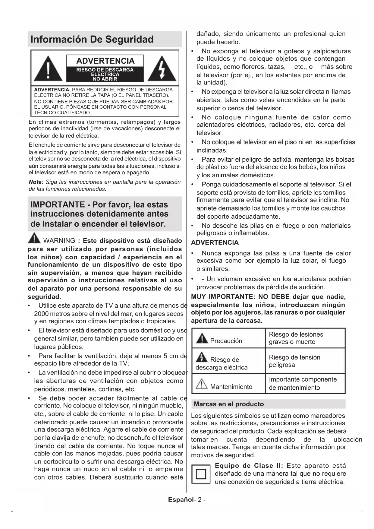 - Información sobre su desecho Español- 2 - Información De Seguridad ADVERTENCIA RIESGO DE DESCARGA ELÉCTRICANO ABRIRADVERTENCIA: PARA REDUCIR EL RIESGO DE DESCARGA ELÉCTRICA NO RETIRE LA TAPA (O EL PANEL TRASERO). NO CONTIENE PIEZAS QUE PUEDAN SER CAMBIADAS POR EL USUARIO. PÓNGASE EN CONTACTO CON PERSONAL TÉCNICO CUALIFICADO.Nota: Siga las instrucciones en pantalla para la operación de las funciones relacionadas.En climas extremos (tormentas, relámpagos) y largos periodos de inactividad (irse de vacaciones) desconecte el televisor de la red eléctrica.El enchufe de corriente sirve para desconectar el televisor de la electricidad y, por lo tanto, siempre debe estar accesible. Si el televisor no se desconecta de la red eléctrica, el dispositivo aún consumirá energía para todas las situaciones, incluso si el televisor está en modo de espera o apagado. IMPORTANTE - Por favor, lea estas instrucciones detenidamente antes de instalar o encender el televisor. p. 40