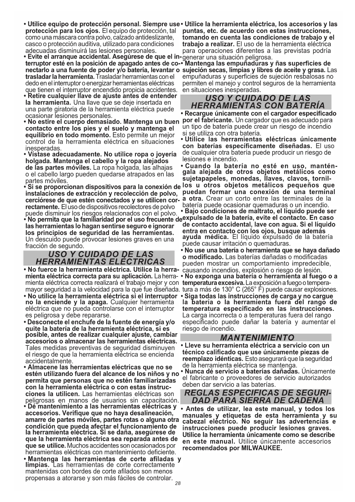 - Antes de utilizar, lea este manual, y todos los manuales y etiquetas de esta herramienta y su cabezal eléctrico. No seguir las advertencias e instrucciones puede producir lesiones graves. Utilice la herramienta únicamente como se describe en este manual. Utilice únicamente accesorios recomendados por MILWAUKEE.29