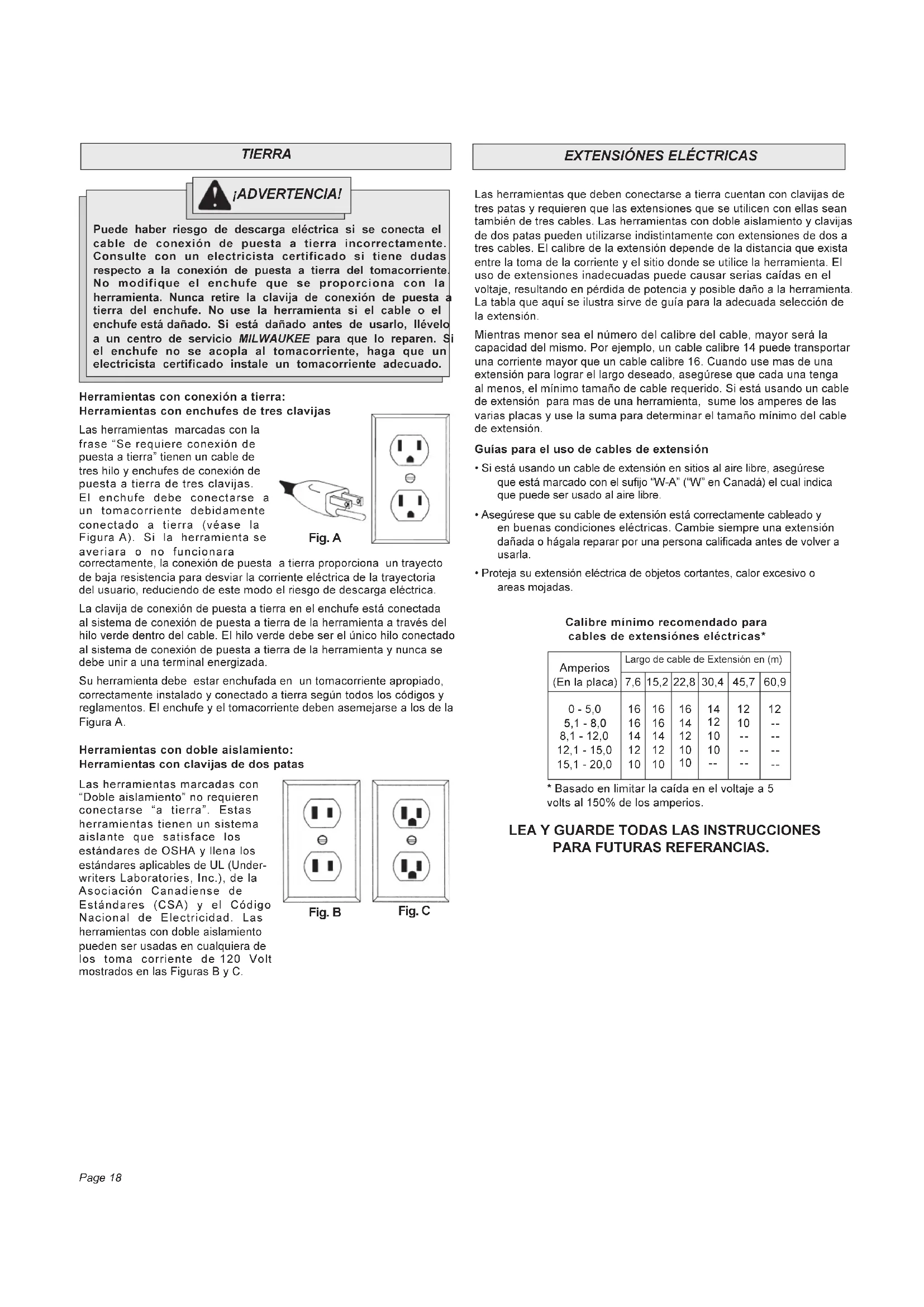 PARA FUTURAS REFERANCIAS. Las herramientas marcadas con Doble aislamiento no requieren conectarse a tierra. Estas herramientas tienen un sistema aislante que satisface los estándares de OSHA y llena los estándares aplicables de UL (Under- writers Laboratories, Inc.), de la Asociación Canadiense de Estándares (CSA) y el Código Nacional de Electricidad. Las herramientas con doble aislamiento pueden ser usadas en cualquiera de los toma corriente de 120 Volt mostrados en las Figuras B y C. ¡ADVERTENCIA! Fig. A Fig. B Fig. CPage 19