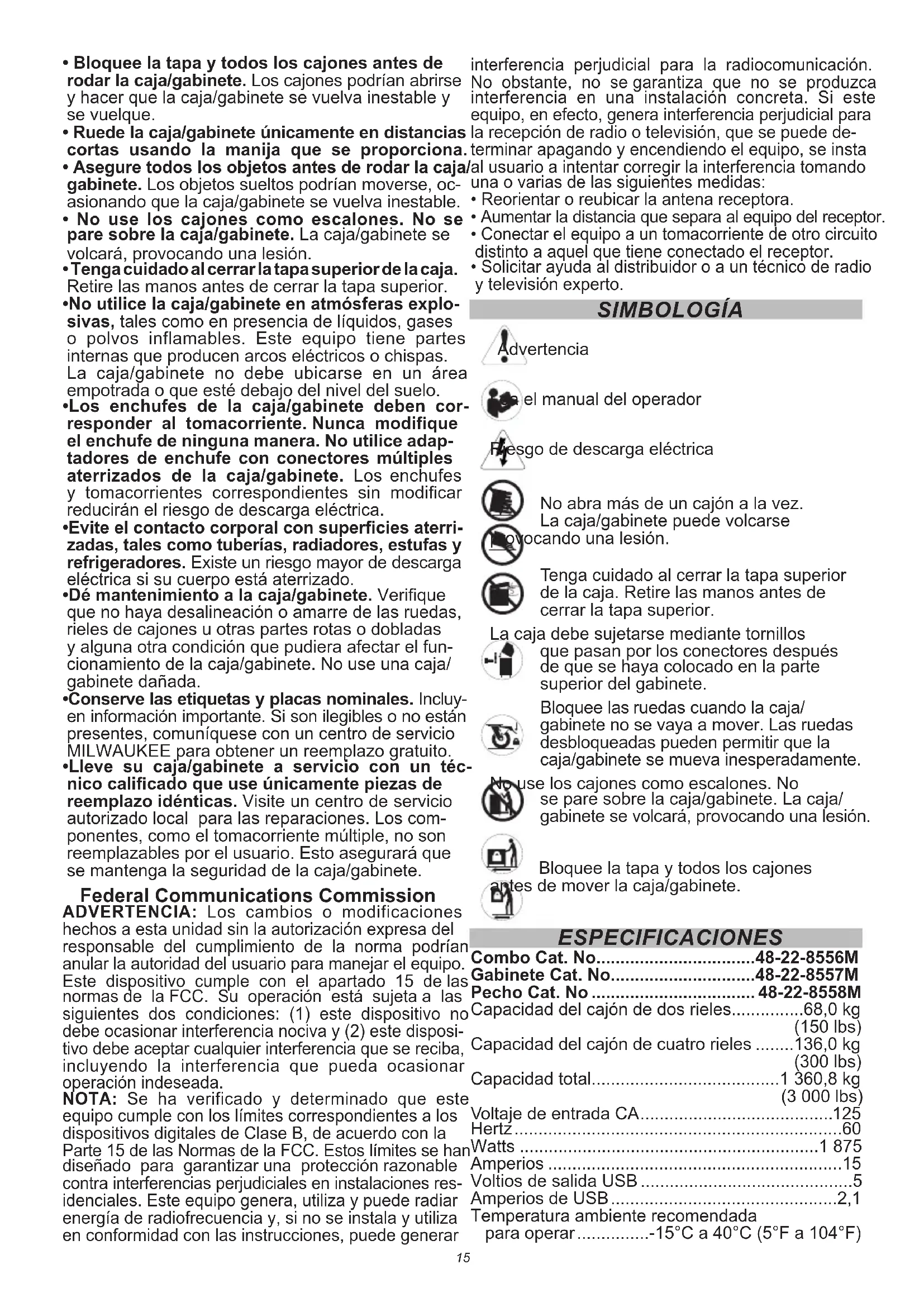 - Solicitar ayuda al distribuidor o a un técnico de radio y televisión experto. SIMBOLOGÍA Advertencia Lea el manual del operador Riesgo de descarga eléctrica No abra más de un cajón a la vez. La caja/gabinete puede volcarse provocando una lesión. Tenga cuidado al cerrar la tapa superior de la caja. Retire las manos antes de cerrar la tapa superior. La caja debe sujetarse mediante tornillos que pasan por los conectores después de que se haya colocado en la parte superior del gabinete. Bloquee las ruedas cuando la caja/ gabinete no se vaya a mover. Las ruedas desbloqueadas pueden permitir que la caja/gabinete se mueva inesperadamente. No use los cajones como escalones. No se pare sobre la caja/gabinete. La caja/ gabinete se volcará, provocando una lesión. FPO Bloquee la tapa y todos los cajones antes de mover la caja/gabinete. ESPECIFICACIONES Combo Cat. No ................................. 48-22-8556M Gabinete Cat. No .............................. 48-22-8557M Pecho Cat. No .................................. 48-22-8558M Capacidad del cajón de dos rieles...............68,0 kg (150 lbs) Capacidad del cajón de cuatro rieles ........136,0 kg (300 lbs) Capacidad total.......................................1 360,8 kg (3 000 lbs) Voltaje de entrada CA ........................................125 Hertz ....................................................................60 Watts ..............................................................1 875 Amperios .............................................................15 Voltios de salida USB ............................................5 Amperios de USB ...............................................2,1 Temperatura ambiente recomendada para operar ...............-15°C a 40°C (5°F a 104°F)16 DESCRIPCION FUNCIONAL