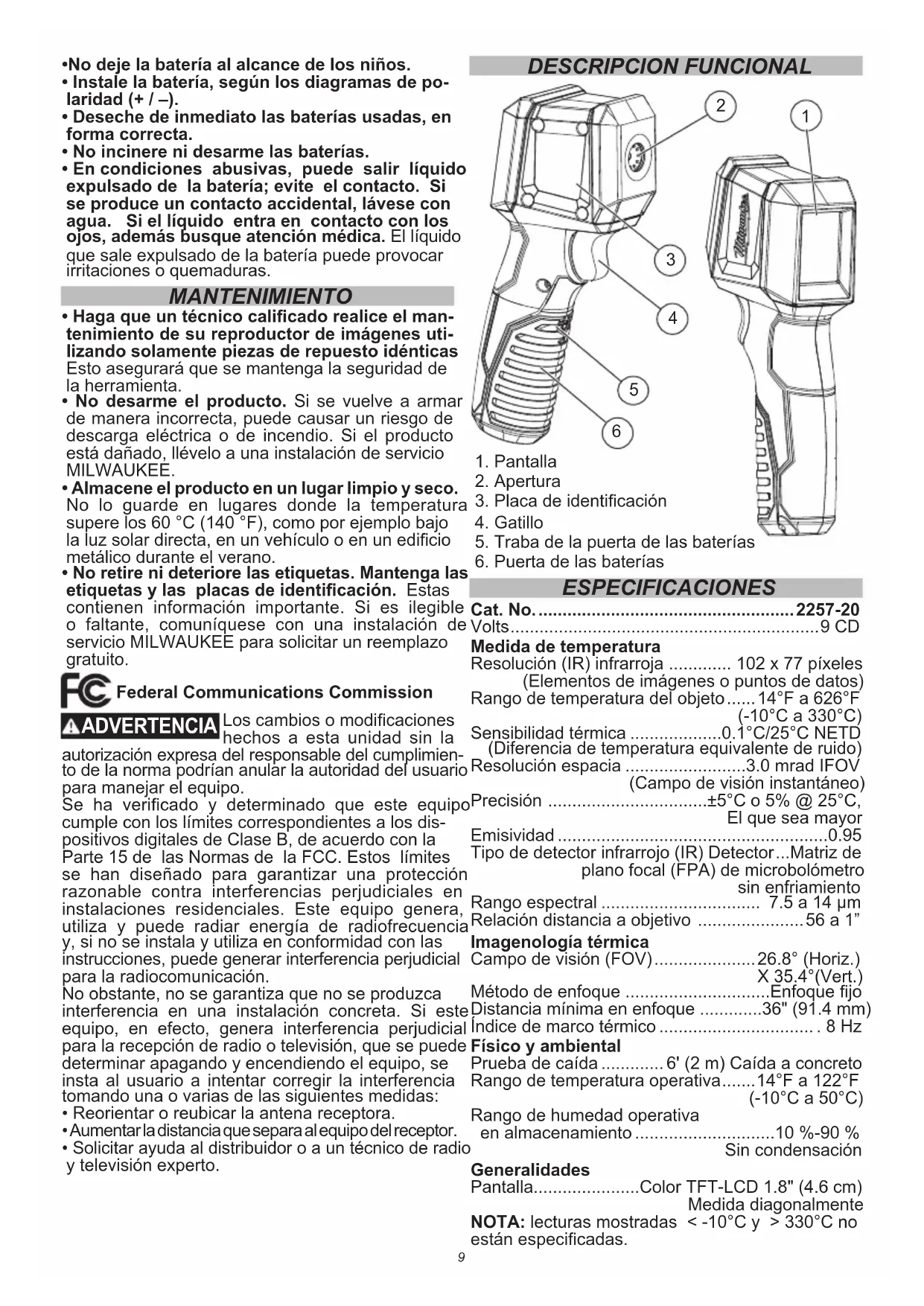 ESPECIFICACIONES Cat. No. ..................................................... 2257-20 Volts ................................................................ 9 CD Medida de temperatura Resolución (IR) infrarroja ............. 102 x 77 píxeles (Elementos de imágenes o puntos de datos) Rango de temperatura del objeto ...... 14°F a 626°F (-10°C a 330°C) Sensibilidad térmica ...................0.1°C/25°C NETD (Diferencia de temperatura equivalente de ruido) Resolución espacia .........................3.0 mrad IFOV (Campo de visión instantáneo) Precisión .................................±5°C o 5% @ 25°C, El que sea mayor Emisividad ........................................................0.95 Tipo de detector infrarrojo (IR) Detector ...Matriz de plano focal (FPA) de microbolómetro sin enfriamiento Rango espectral ................................. 7.5 a 14 μm Relación distancia a objetivo ...................... 56 a 1” Imagenología térmica Campo de visión (FOV) ..................... 26.8° (Horiz.) X 35.4°(Vert.) Método de enfoque ..............................Enfoque jo Distancia mínima en enfoque .............36" (91.4 mm) Índice de marco térmico ................................ . 8 Hz Físico y ambiental Prueba de caída ............. 6' (2 m) Caída a concreto Rango de temperatura operativa ....... 14°F a 122°F (-10°C a 50°C) Rango de humedad operativa en almacenamiento .............................10 %-90 % Sin condensación Generalidades Pantalla......................Color TFT-LCD 1.8" (4.6 cm) Medida diagonalmente NOTA: lecturas mostradas < -10°C y > 330°C no están especicadas.10 SIMBOLOGÍA Volts Corriente continua Para reducir el riesgo de lesiones, el usuario debe leer y entender el manual del operador ENSAMBLAJE Instalación/Cambio de las baterías