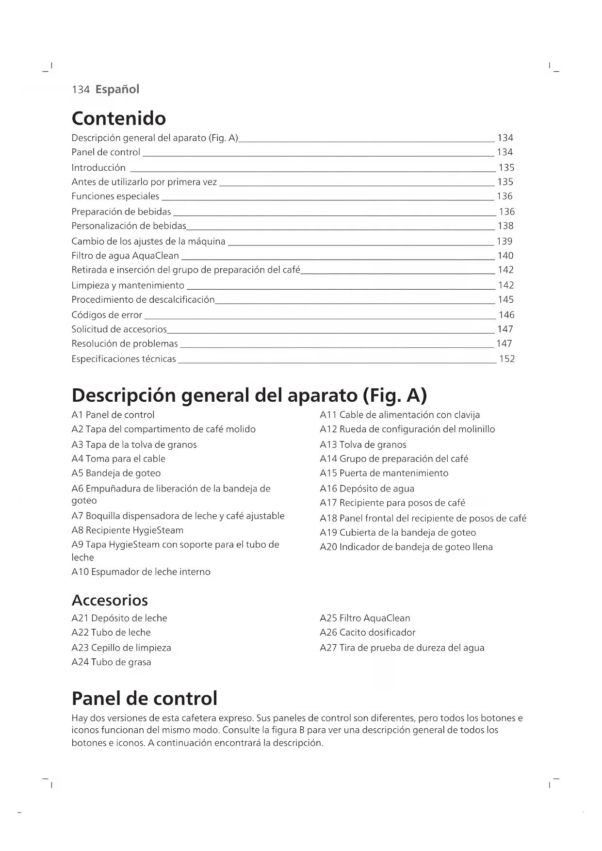 Español Contenido Descripción general del aparato (Fig. A)______________________________________________________ 134 Panel de control __________________________________________________________________________ 134 Introducción _____________________________________________________________________________ 135 Antes de utilizarlo por primera vez __________________________________________________________ 135 Funciones especiales ______________________________________________________________________ 136 Preparación de bebidas ____________________________________________________________________ 136 Personalización de bebidas_________________________________________________________________ 138 Cambio de los ajustes de la máquina ________________________________________________________ 139 Filtro de agua AquaClean __________________________________________________________________ 140 Retirada e inserción del grupo de preparación del café_________________________________________ 142 Limpieza y mantenimiento _________________________________________________________________ 142 Procedimiento de descalcificación___________________________________________________________ 145 Códigos de error __________________________________________________________________________ 146 Solicitud de accesorios_____________________________________________________________________ 147 Resolución de problemas __________________________________________________________________ 147 Especificaciones técnicas ___________________________________________________________________ 152 Descripción general del aparato (Fig. A) A1 Panel de control A2 Tapa del compartimento de café molido A3 Tapa de la tolva de granos A4 Toma para el cable A5 Bandeja de goteo A6 Empuñadura de liberación de la bandeja de goteo A7 Boquilla dispensadora de leche y café ajustable A8 Recipiente HygieSteam A9 Tapa HygieSteam con soporte para el tubo de leche A10 Espumador de leche interno A11 Cable de alimentación con clavija A12 Rueda de configuración del molinillo A13 Tolva de granos A14 Grupo de preparación del café A15 Puerta de mantenimiento A16 Depósito de agua A17 Recipiente para posos de café A18 Panel frontal del recipiente de posos de café A19 Cubierta de la bandeja de goteo A20 Indicador de bandeja de goteo llena Accesorios A21 Depósito de leche A22 Tubo de leche A23 Cepillo de limpieza A24 Tubo de grasa A25 Filtro AquaClean A26 Cacito dosificador A27 Tira de prueba de dureza del agua Panel de control Hay dos versiones de esta cafetera expreso. Sus paneles de control son diferentes, pero todos los botones e iconos funcionan del mismo modo. Consulte la figura B para ver una descripción general de todos los botones e iconos. A continuación encontrará la descripción.135 Español Utilice las flechas hacia arriba y hacia abajo para desplazarse por la pantalla y toque el icono OK (Aceptar) para seleccionar o confirmar las selecciones. B1 Botón de encendido/apagado B2 Iconos de bebidas con un solo toque: B3 Icono de CoffeeMaestro B4 Menú con más bebidas B5 Botón de inicio/parada B6 Iconos de navegación (arriba, abajo, atrás, aceptar) B7 Pantalla B8 Ajustes de la cafetera B9 Menú de limpieza B10 Perfiles personales Introducción Enhorabuena por la adquisición de una cafetera totalmente automática Saeco. Para disfrutar de todo el soporte en línea que Saeco ofrece, visite www.saeco.com/MyCoffeeMachine y registre su producto. Nota: Este aparato se ha probado con café. Aunque se ha limpiado cuidadosamente, es posible que quede algún residuo de café. Le garantizamos, no obstante, que el aparato es absolutamente nuevo. Antes de utilizarlo por primera vez