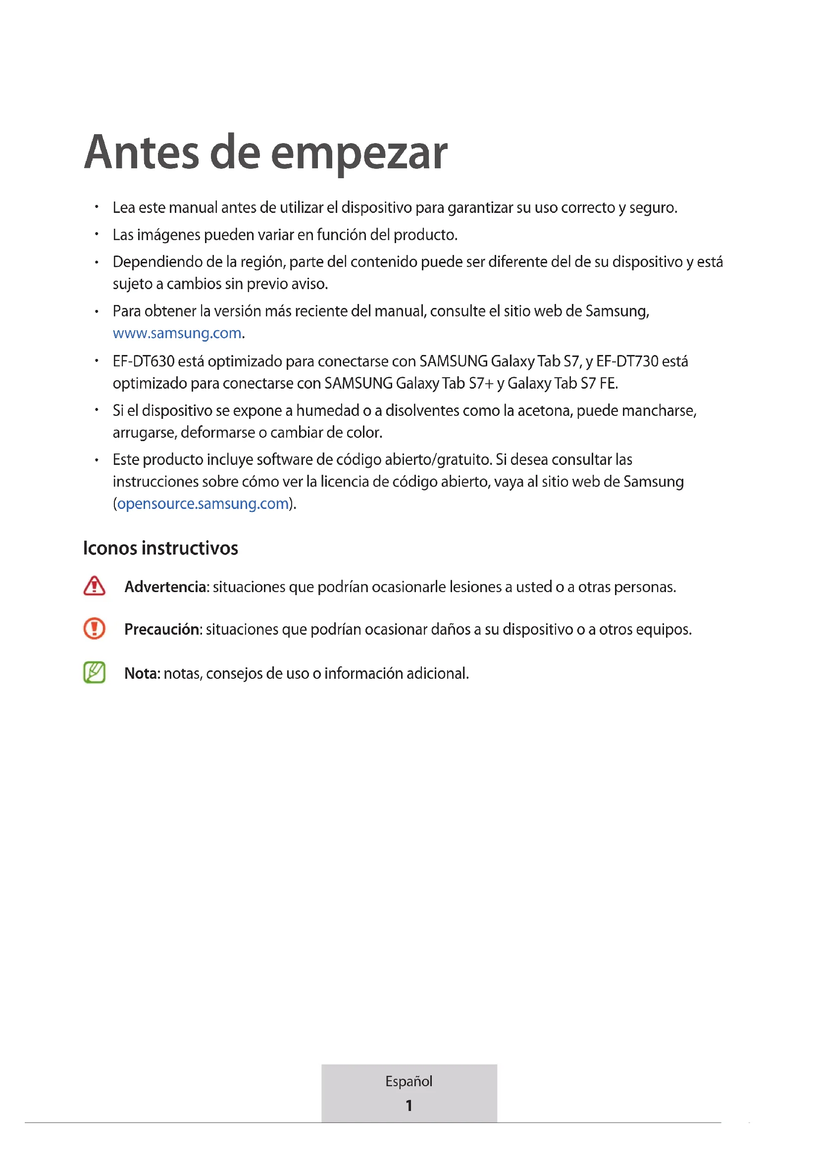 Este producto incluye software de código abierto/gratuito. Si desea consultar las instrucciones sobre cómo ver la licencia de código abierto, vaya al sitio web de Samsung (opensource.samsung.com). Iconos instructivos Advertencia: situaciones que podrían ocasionarle lesiones a usted o a otras personas. Precaución: situaciones que podrían ocasionar daños a su dispositivo o a otros equipos. Nota: notas, consejos de uso o información adicional.2 Español Primeros pasos Contenido de la caja