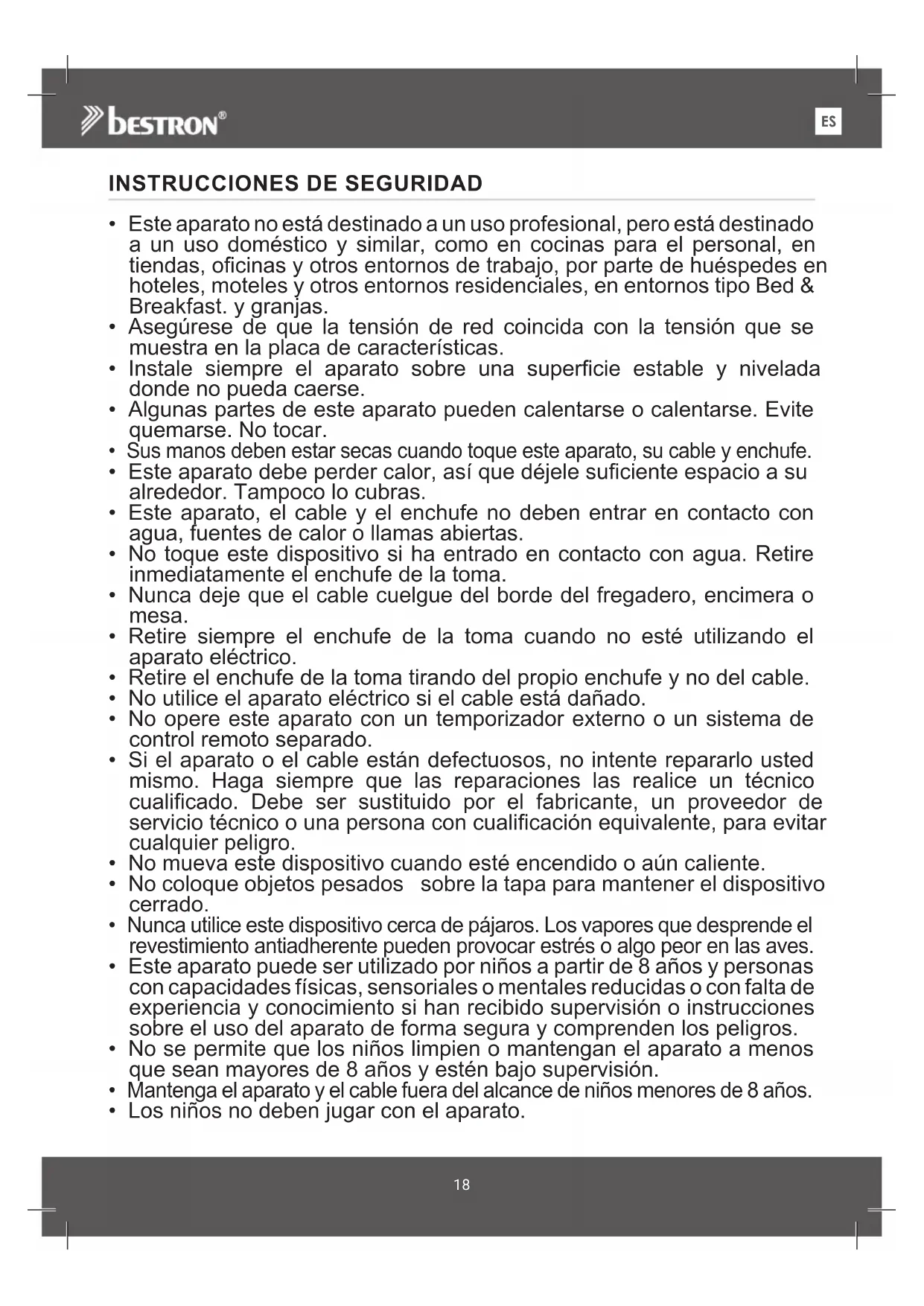 - Su municipio puede indicarle dónde encontrar el punto de recogida de residuos designado en su barrio. SERVICIO En el improbable caso de que se produzca un mal funcionamiento, póngase en contacto con el servicio de atención al cliente de Bestron: www.bestron.com/service Especificaciones técnicas Modelo ARG150BW Red eléctrica (V) 220-240V~ Frecuencia (Hz) 50/60 Clase de seguridad 1 Energía (Watt) 350 Ruido (dB(A)) - Max. Capacidad - Tiempo máximo de funcionamiento continuo (KB) - Dimensiones (largo x ancho x alto) (cm) 31,5x10,5x10,8 Longitud del cable (cm) 82 ALGUNAS PARTES DEL APARATO PEUDEN CALENTARSE,