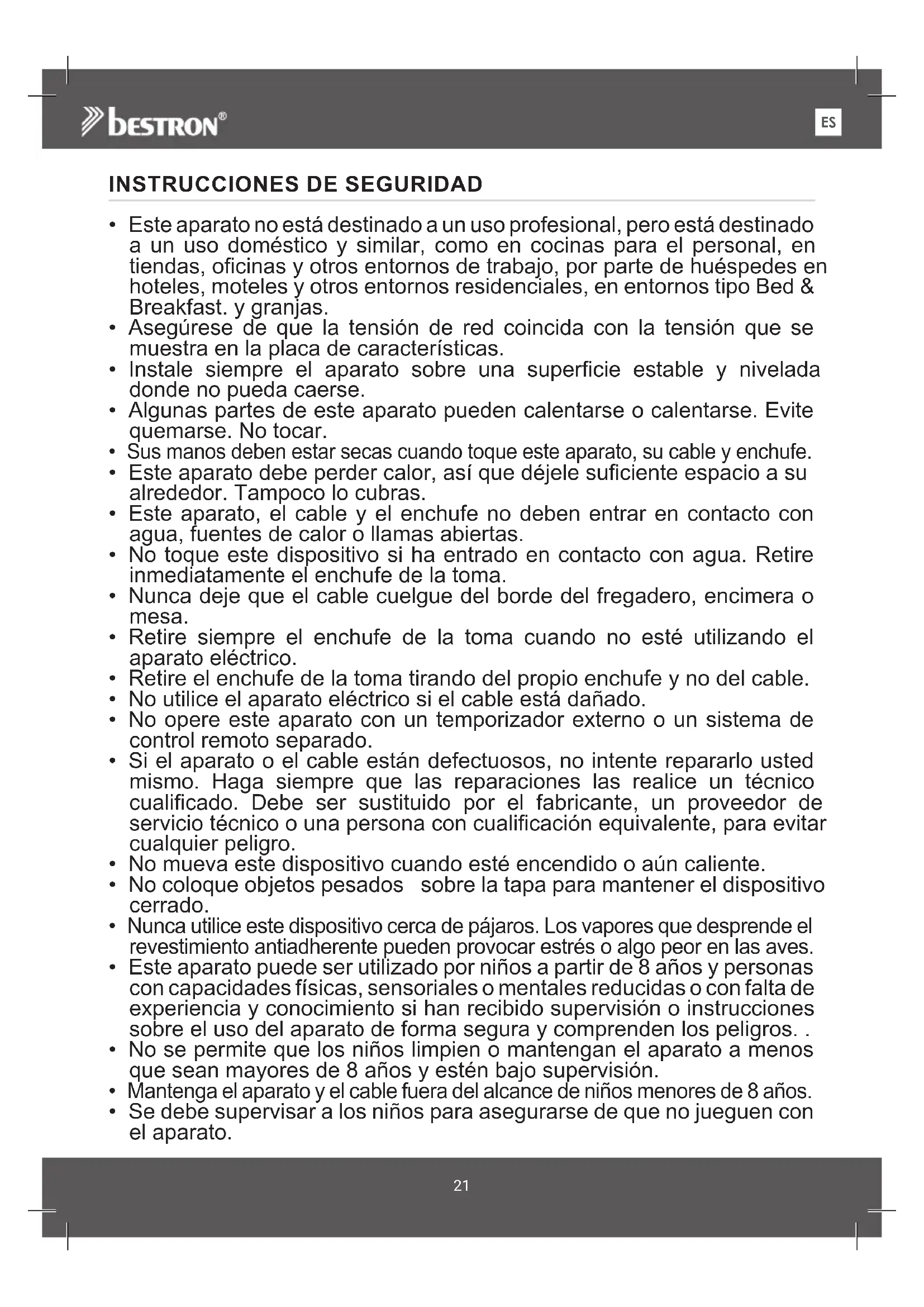 Procure que no se acerque ningún pájaro al aparato mientras éste esté en funcionamiento. Al calentarse, la capa antiadherente de la plancha puede desprender una sustancia perjudicial para los pájaros.23