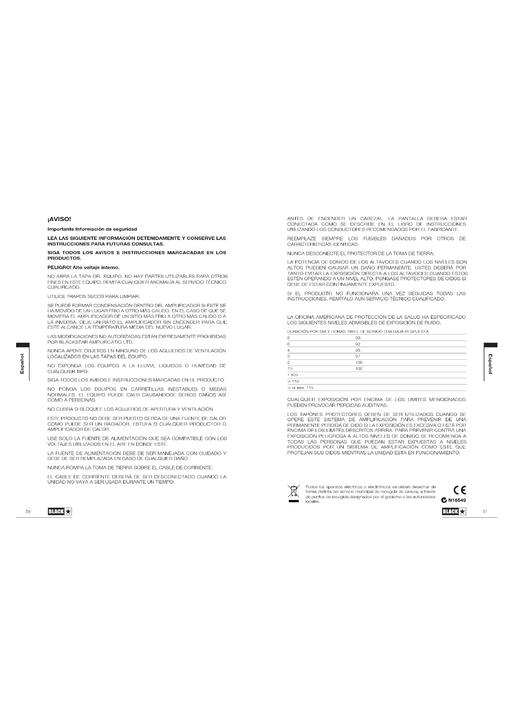 ½ 110 ¼ or less 115 CUALQUIER EXPOSICIÓN POR ENCIMA DE LOS LIMITES MENCIONADOS PUEDEN PROVOCAR PERDIDAS AUDITIVAS. LOS TAPONES PROTECTORES DEBEN DE SER UTILIZADOS CUANDO SE OPERE ESTE SISTEMA DE AMPLIFICACIÓN PARA PREVENIR DE UNA PERMANENTE PERDIDA DE OIDO SI LA EXPOSICIÓN ES EXCESIVA O ESTÁ POR ENCIMA DE LOS LIMITES DESCRITOS ARRIBA. PARA PREVENIR CONTRA UNA EXPOSICIÓN PELIGROSA A ALTOS NIVELES DE SONIDO SE RECOMIENDA A TODAS LAS PERSONAS QUE PUEDAN ESTAR EXPUESTAS A NIVELES PRODUCIDOS POR UN SISTEMA DE AMPLIFICACIÓN COMO ESTE QUE PROTEJAN SUS OIDOS MIENTRAS LA UNIDAD ESTÁ EN FUNCIONAMIENTO.