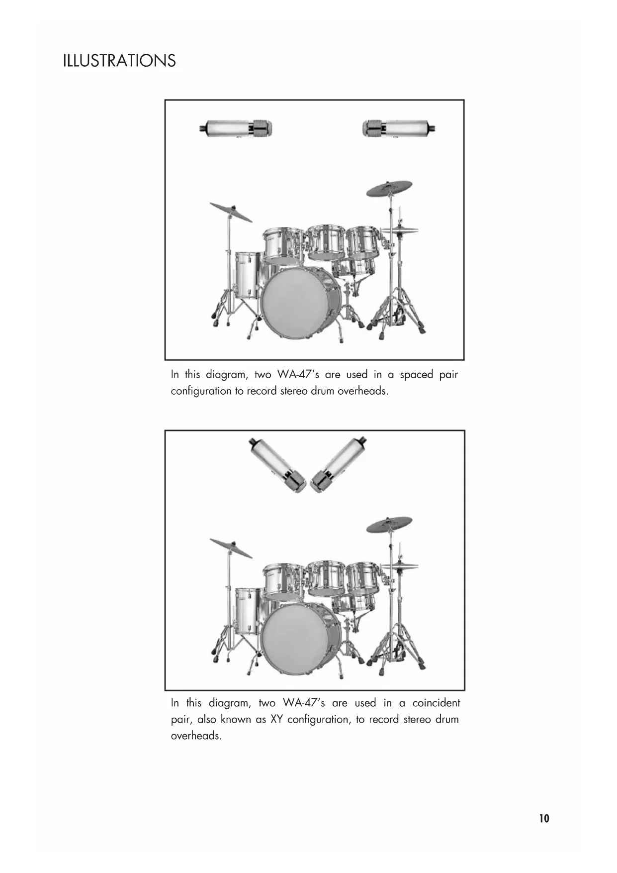 La cápsula El WA-47 utiliza orgullosamente una reproducción especialmente diseñada de la antigua cápsula estilo 47 utilizada en el clásico micrófono del 47, diseñada con el mismo patrón de orificios y respuesta de frecuencia. Nuestra versión de esta cápsula (modelo n. ° WA-47-B-80v) fue fabricada meticulosamente por un proveedor de cápsulas australiano y reproduce exactamente las especificaciones del modelo antiguo. Nos complace ofrecer la reencarnación de una grandiosa cápsula de estilo 47 porque nos permite ajustar el sonido al componente más importante de la fórmula. El tubo Un tubo de vacío JJ 5751 de la República Eslovaca es un tubo de menor ganacia y de bajo ruido que fuerza la mayoría del sonido de la cápsula y el transformador en el WA-47 para que se escuche más significativamente que otros tubos de ganancia alta. El transformador y la cápsula en los micrófonos antiguos del 47 son fundamentales para obtener el tono clásico y descubrimos que este tubo particular realmente permite que estos 2 otros componentes en el WA-47 se acentúen. Audicionamos 4 marcas de tubos diferentes y nos enamoramos del JJ 5751. La respuesta de frecuencia del tubo JJ y la manera en que contribuye al circuito es de una naturaleza tonal limpia y clásica. Descubrimos que este tubo nos dio la esencia del antiguo circuito de tubo del 47 sin el espejamiento eléctrico del tubo de acero original VF14 que ya no se encuentra disponible. El transformador El WA-47 utiliza un transformador estadounidense de marca TAB-Funkenwerk (AMI) con un gran núcleo importado de laminaciones alemanas. Este transformador ayuda a proporcionar una gama superior homogénea y cremosa y una GRAN gama inferior que uno espera obtener de un micrófono condensador de estilo 47. El cable Un componente de un micrófono de tubo que a menudo pasa desapercibido es el cable de 7 pines que conecta el micrófono al suministro de energía. Cuando audicionamos el WA-47 y otros micrófonos de tubo, aprendimos bastante sobre los cables de 7 pines y cómo la protección y el tamaño de calibre del cable pueden cambiar drásticamente el sonido de un tubo de micrófono. Nos hemos asociado a Gotham Audio en Suiza para usar su «cable GAC-7» de 7 pines de primera calidad y construido minuciosamente. Usar este cable aumenta la presencia de la gama superior y el tamaño total de la imagen grabada en el campo estéreo al reducir el desplazamiento de fase y el efecto parasitario que a menudo se presentan en los cables de mala calidad. El cableado de Gotham es muy costoso y exclusivo en su naturaleza y no se debe considerar una adición menor al paquete WA-47. Los capacitores El WA-47 usa orgullosamente un capacitor en par de poliestireno, capacitores de películas wima de principio a fin, y un capacitor francés importado marca Solen como salida. ILLUSTRATIONS In this diagram, two WA-47’s are used in a spaced pair configuration to record stereo drum overheads. In this diagram, two WA-47’s are used in a coincident pair, also known as XY configuration, to record stereo drum overheads.9 22 ESPAÑOL CARACTERÍSTICAS