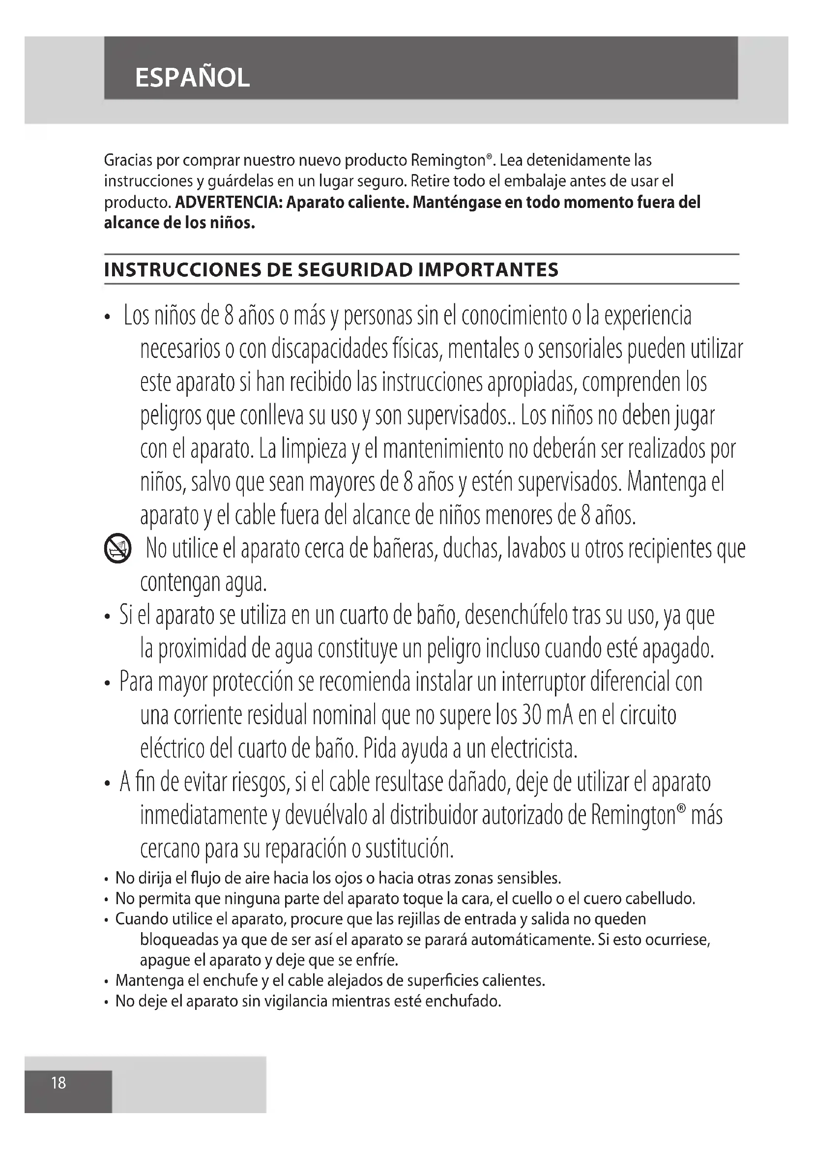 AE18 Gracias por comprar nuestro nuevo producto Remington®. Lea detenidamente las instrucciones y guárdelas en un lugar seguro. Retire todo el embalaje antes de usar el producto. ADVERTENCIA: Aparato caliente. Manténgase en todo momento fuera del alcance de los niños.