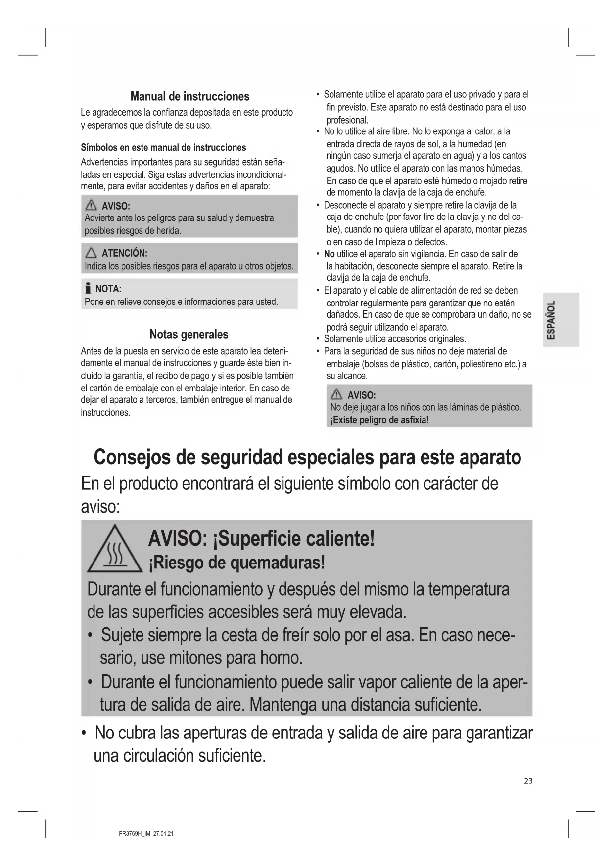 - No cubra las aperturas de entrada y salida de aire para garantizar una circulación suciente.FR3769H_IM 27.01.21