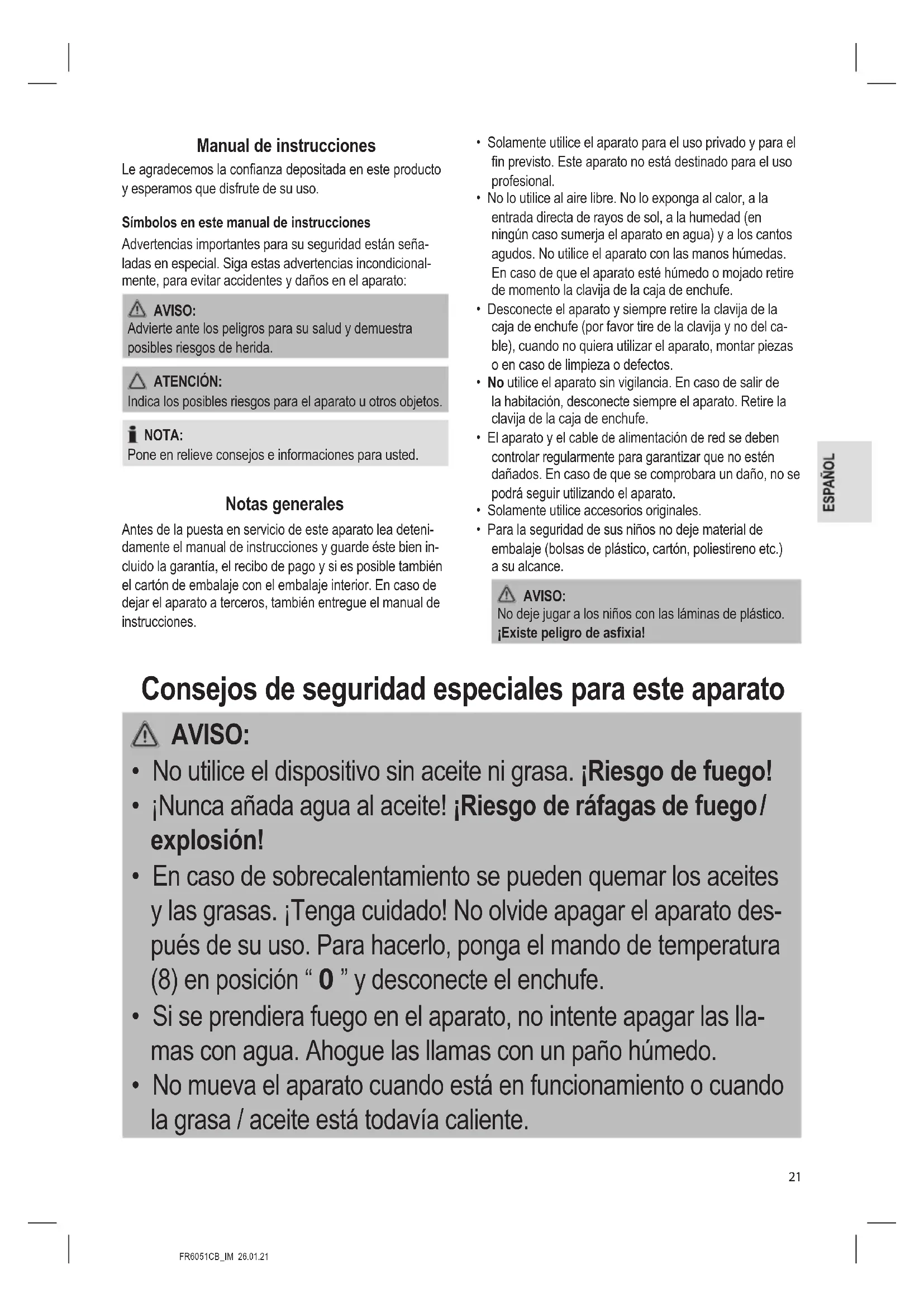 - No mueva el aparato cuando está en funcionamiento o cuando la grasa / aceite está todavía caliente.FR6051CB_IM 26.01.21