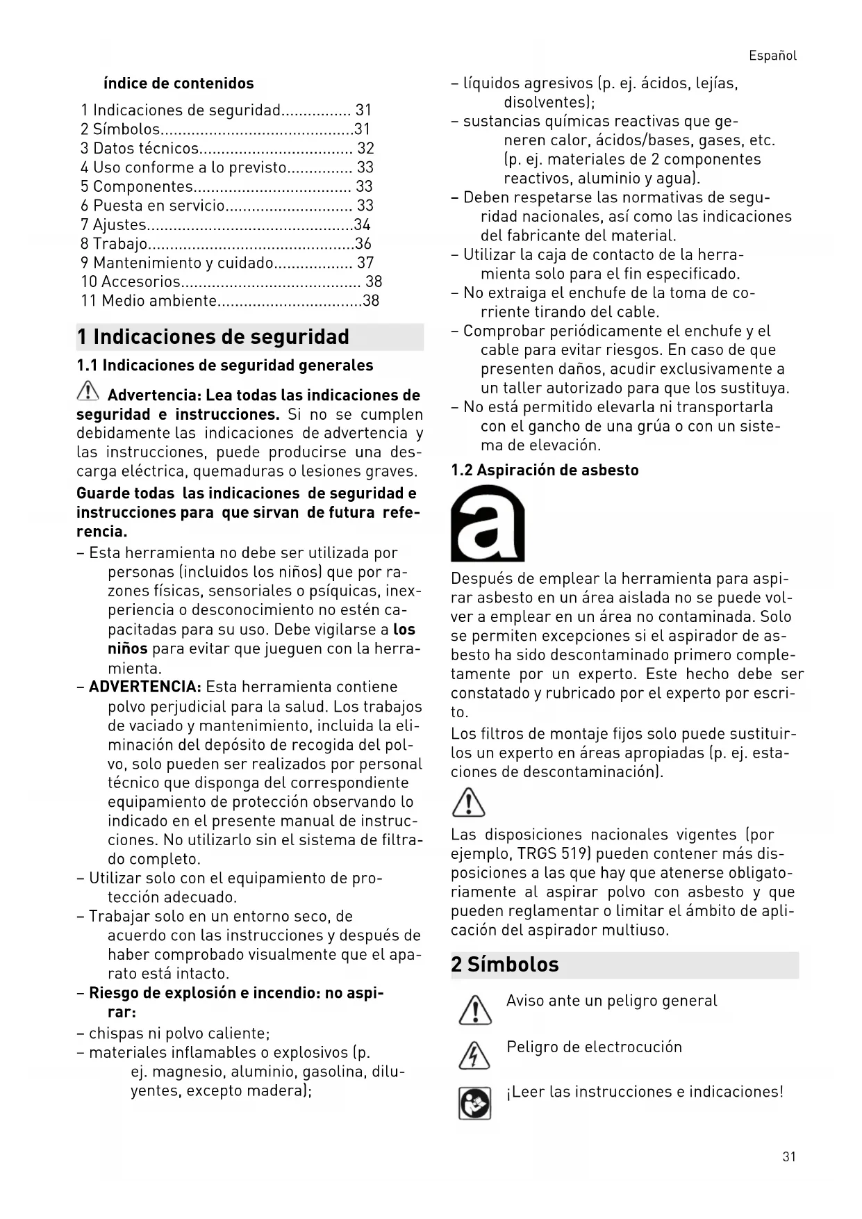 Después de emplear la herramienta para aspi rar asbesto en un área aislada no se puede vol ver a emplear en un área no contaminada. Solo se permiten excepciones si el aspirador de as besto ha sido descontaminado primero comple tamente por un experto. Este hecho debe ser constatado y rubricado por el experto por escri to. Los filtros de montaje fijos solo puede sustituir los un experto en áreas apropiadas (p. ej. esta ciones de descontaminación). Las disposiciones nacionales vigentes (por ejemplo, TRGS 519) pueden contener más dis posiciones a las que hay que atenerse obligato riamente al aspirar polvo con asbesto y que pueden reglamentar o limitar el ámbito de apli cación del aspirador multiuso. 2 Símbolos Aviso ante un peligro general Peligro de electrocución ¡Leer las instrucciones e indicaciones! Español 31¡Utilizar protección respiratoria! No pertenece a los residuos comuna les. ¡Atención contiene asbesto! Caja de contacto con conexión au tomática WARNUNG ≤ 0,1 mg/m
