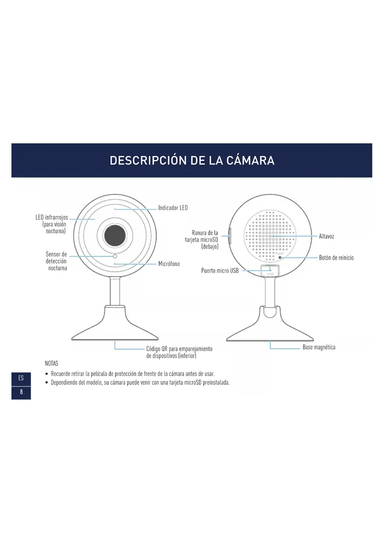 Sensor de detección nocturna Ranura de la tarjeta microSD (debajo) LED infrarrojos (para visión nocturna) Micrófono Base magnética Indicador LED Altavoz Botón de reinicio Puerto micro USB NOTAS