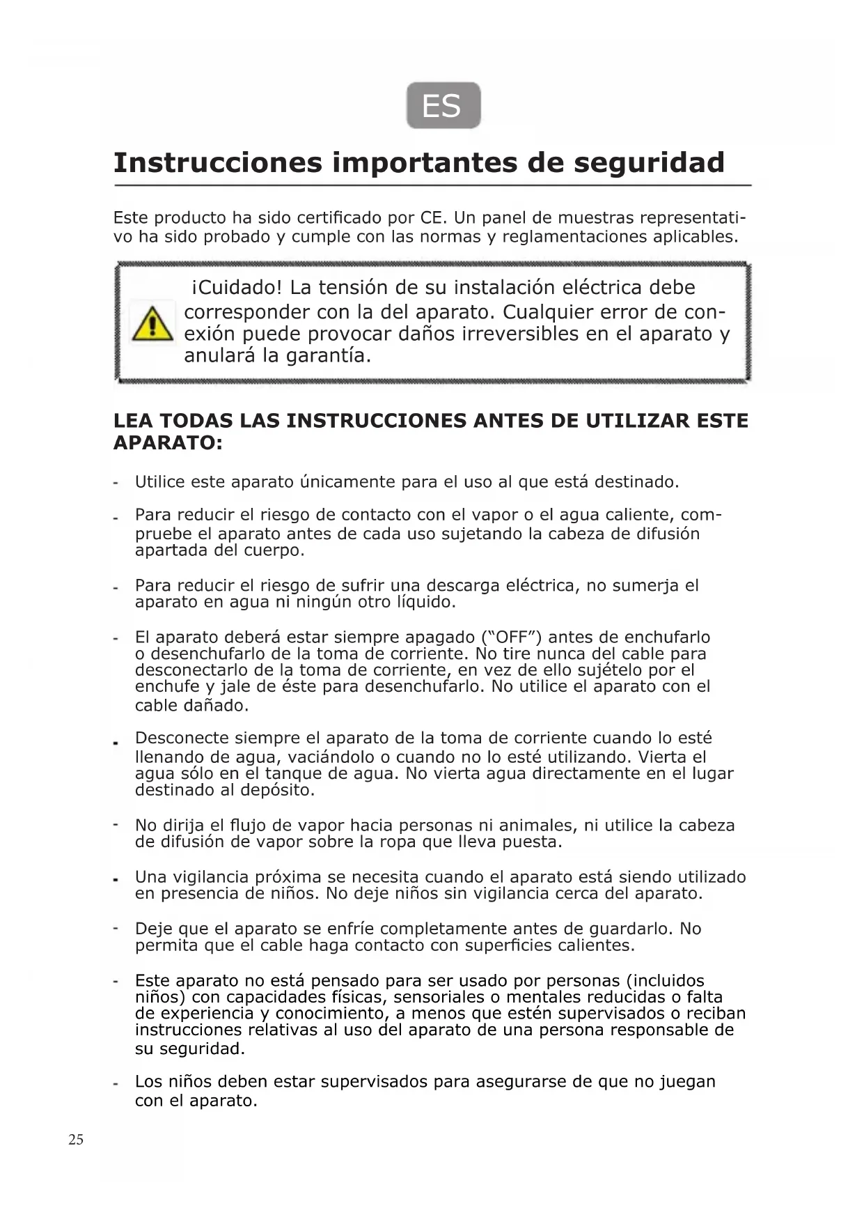 Gooi het apparaat aan het einde van zijn levensduur niet weg met het normale huisvuil, maar lever het in op een door de overheid aangewezen inzamelpunt om het te laten recyclen. Op die manier levert u een bijdrage aan een schonere leefomgeving Conform relevante veiligheidsnormen25 Instrucciones importantes de seguridad LEA TODAS LAS INSTRUCCIONES ANTES DE UTILIZAR ESTE APARATO: Este producto ha sido certicado por CE. Un panel de muestras representati- vo ha sido probado y cumple con las normas y reglamentaciones aplicables. Utilice este aparato únicamente para el uso al que está destinado. Para reducir el riesgo de contacto con el vapor o el agua caliente, com- pruebe el aparato antes de cada uso sujetando la cabeza de difusión apartada del cuerpo. Para reducir el riesgo de sufrir una descarga eléctrica, no sumerja el aparato en agua ni ningún otro líquido. El aparato deberá estar siempre apagado (“OFF”) antes de enchufarlo o desenchufarlo de la toma de corriente. No tire nunca del cable para desconectarlo de la toma de corriente, en vez de ello sujételo por el enchufe y jale de éste para desenchufarlo. No utilice el aparato con el cable dañado. Desconecte siempre el aparato de la toma de corriente cuando lo esté llenando de agua, vaciándolo o cuando no lo esté utilizando. Vierta el agua sólo en el tanque de agua. No vierta agua directamente en el lugar destinado al depósito. No dirija el ujo de vapor hacia personas ni animales, ni utilice la cabeza de difusión de vapor sobre la ropa que lleva puesta. Una vigilancia próxima se necesita cuando el aparato está siendo utilizado en presencia de niños. No deje niños sin vigilancia cerca del aparato. Deje que el aparato se enfríe completamente antes de guardarlo. No permita que el cable haga contacto con supercies calientes. Este aparato no está pensado para ser usado por personas (incluidos niños) con capacidades físicas, sensoriales o mentales reducidas o falta de experiencia y conocimiento, a menos que estén supervisados o reciban instrucciones relativas al uso del aparato de una persona responsable de su seguridad. Los niños deben estar supervisados para asegurarse de que no juegan con el aparato. ¡Cuidado! La tensión de su instalación eléctrica debe corresponder con la del aparato. Cualquier error de con- exión puede provocar daños irreversibles en el aparato y anulará la garantía. ES26 Los niños de más de 14 años y las per- sonas con capacidades físicas, sensoria- les o mentales reducidas, falta de expe- riencia y conocimiento pueden utilizar este aparato si están supervisados o reciben instrucciones relativas al uso se- guro del aparato y entienden los peligros que conlleva. Los niños no deben jugar con el aparato. Niños sin supervisión no realizarán la limpieza ni el mantenimiento de usuario. Para las instrucciones de mantenimiento vea la sección “Mantenimiento”. Si el cable de alimentación se daña, debe ser sustituido por el fabricante, su agente de servicio o personal calicado semejante con el n de evitar riesgos. Cuando se utilice el aparato se debe tener cuidado con la emisión de vapor de agua. Desconecte siempre el aparato de la toma de corriente cuando lo esté llenando de agua, vaciándolo o cuando no lo esté utilizando. ES27 No utilice el aparato si está dañado. Si el aparato está dañado, éste debe sustituirse por el fabricante, por su agente de servicio autorizado o por personal calicado con el n de evitar un peligro. Un montaje incorrecto podría provocar riesgo de incendio, lesiones y/o una descarga eléctrica a la persona que lo está utilizando. Tome extrema precaución cuando vacíe un depósito de agua; el agua contenida puede estar caliente. Podrían producirse quemaduras al tocar partes metálicas calientes, agua caliente o vapor. Cuando vaya a cambiar de accesorios, asegúrese de que el aparato está apagado y de que no se libera vapor para evitar el contacto con agua caliente. Mantenga siempre el tubo exible y la cabeza elevados por encima del depósito de agua. Aplique el vapor con movimientos verticales hacia arriba y hacia abajo solamente. No utilice nunca la cabeza de difusión de vapor en posición horizontal ni la incline hacia atrás, podría provocar la descarga de agua caliente. No coloque el cabezal de vapor directamente sobre ninguna supercie ni sobre el cable de corriente del aparato mientras esté caliente o el aparato enchufado, esto podría ser causa de incendio, descarga eléctrica o lesiones. No introduzca ni deje caer nunca ningún objeto en ningún oricio ni en el tubo del aparato. No se recomienda el uso de otros accesorios que no sean los suministra- dos por Steamone, ello podría ser causa de incendio, descarga eléctrica o lesiones. Este aparato no puede ser utilizado fuera. No corte ni intente alargar el tubo de vapor. Para prevenir un exceso de calentamiento del aparato, cuando cuelgue prendas en el perchero para eliminar las arrugas, arme la barra telescópi- ca completa incluida con el aparato y extiéndala a su posición más alta. No deje que el centro de planchado vertical funcione si el depósito de agua está vacío. Para evitar una sobrecarga del circuito, no conecte ningún otro aparato de alta potencia al mismo circuito. En el caso de que el uso de una extensión sea absolutamente necesario, se sugiere adoptar las debidas precauciones para extender el cable de modo que nadie pueda darle un tirón o tropezar con él y caerse. INSTRUCCIONES ESPECIALES: ES28 -Su aparato contiene materiales valorizables o reciclables. -Para deshacerse de él, llévelo a un punto de recolección especíco. GUARDE ESTAS INSTRUCCIONES: