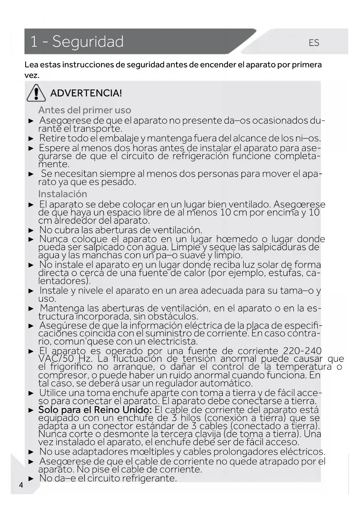 ADVERTENCIA! Antes del primer uso ▶ Asegúrese de que el aparato no presente daños ocasionados du- rante el transporte. ▶ Retire todo el embalaje y mantenga fuera del alcance de los niños. ▶ Espere al menos dos horas antes de instalar el aparato para ase- gurarse de que el circuito de refrigeración funcione completa- mente. ▶ Se necesitan siempre al menos dos personas para mover el apa- rato ya que es pesado. Instalación ▶ El aparato se debe colocar en un lugar bien ventilado. Asegúrese de que haya un espacio libre de al menos 10 cm por encima y 10 cm alrededor del aparato. ▶ No cubra las aberturas de ventilación. ▶ Nunca coloque el aparato en un lugar húmedo o lugar donde pueda ser salpicado con agua. Limpie y seque las salpicaduras de agua y las manchas con un paño suave y limpio. ▶ No instale el aparato en un lugar donde reciba luz solar de forma directa o cerca de una fuente de calor (por ejemplo, estufas, ca- lentadores). ▶ Instale y nivele el aparato en un area adecuada para su tamaño y uso. ▶ Mantenga las aberturas de ventilación, en el aparato o en la es- tructura incorporada, sin obstáculos. ▶ Asegúrese de que la información eléctrica de la placa de especi- caciones coincida con el suministro de corriente. En caso contra- rio, comuníquese con un electricista. ▶ El aparato es operado por una fuente de corriente 220-240 VAC/50 Hz. La uctuación de tensión anormal puede causar que el frigoríco no arranque, o dañar el control de la temperatura o compresor, o puede haber un ruido anormal cuando funciona. En tal caso, se deberá usar un regulador automático. ▶ Utilice una toma enchufe aparte con toma a tierra y de fácil acce- so para conectar el aparato. El aparato debe conectarse a tierra. ▶ Solo para el Reino Unido: El cable de corriente del aparato está equipado con un enchufe de 3 hilos (conexión a tierra) que se adapta a un conector estándar de 3 cables (conectado a tierra). Nunca corte o desmonte la tercera clavija (de toma a tierra). Una vez instalado el aparato, el enchufe debe ser de fácil acceso. ▶ No use adaptadores múltiples y cables prolongadores eléctricos. ▶ Asegúrese de que el cable de corriente no quede atrapado por el aparato. No pise el cable de corriente. ▶ No dañe el circuito refrigerante.