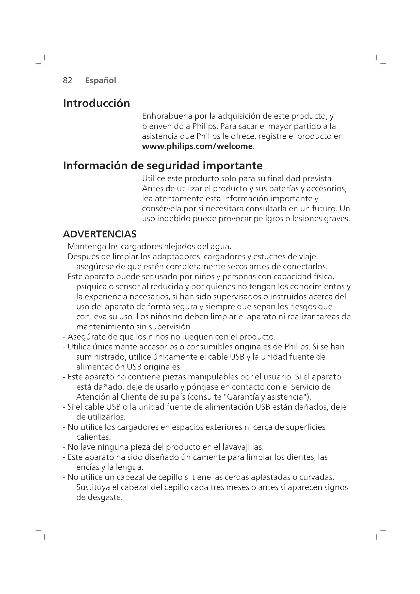 Español Introducción Enhorabuena por la adquisición de este producto, y bienvenido a Philips. Para sacar el mayor partido a la asistencia que Philips le ofrece, registre el producto en www.philips.com/welcome. Información de seguridad importante Utilice este producto solo para su finalidad prevista. Antes de utilizar el producto y sus baterías y accesorios, lea atentamente esta información importante y consérvela por si necesitara consultarla en un futuro. Un uso indebido puede provocar peligros o lesiones graves. ADVERTENCIAS - Mantenga los cargadores alejados del agua. - Después de limpiar los adaptadores, cargadores y estuches de viaje, asegúrese de que estén completamente secos antes de conectarlos. - Este aparato puede ser usado por niños y personas con capacidad física, psíquica o sensorial reducida y por quienes no tengan los conocimientos y la experiencia necesarios, si han sido supervisados o instruidos acerca del uso del aparato de forma segura y siempre que sepan los riesgos que conlleva su uso. Los niños no deben limpiar el aparato ni realizar tareas de mantenimiento sin supervisión. - Asegúrate de que los niños no jueguen con el producto. - Utilice únicamente accesorios o consumibles originales de Philips. Si se han suministrado, utilice únicamente el cable USB y la unidad fuente de alimentación USB originales. - Este aparato no contiene piezas manipulables por el usuario. Si el aparato está dañado, deje de usarlo y póngase en contacto con el Servicio de Atención al Cliente de su país (consulte "Garantía y asistencia"). - Si el cable USB o la unidad fuente de alimentación USB están dañados, deje de utilizarlos. - No utilice los cargadores en espacios exteriores ni cerca de superficies calientes. - No lave ninguna pieza del producto en el lavavajillas. - Este aparato ha sido diseñado únicamente para limpiar los dientes, las encías y la lengua. - No utilice un cabezal de cepillo si tiene las cerdas aplastadas o curvadas. Sustituya el cabezal del cepillo cada tresmeses o antes si aparecen signos de desgaste.83 Español - Evite el contacto directo con los productos que contengan aceites esenciales o aceite de coco. El contacto puede provocar el desplazamiento de las cerdas.
