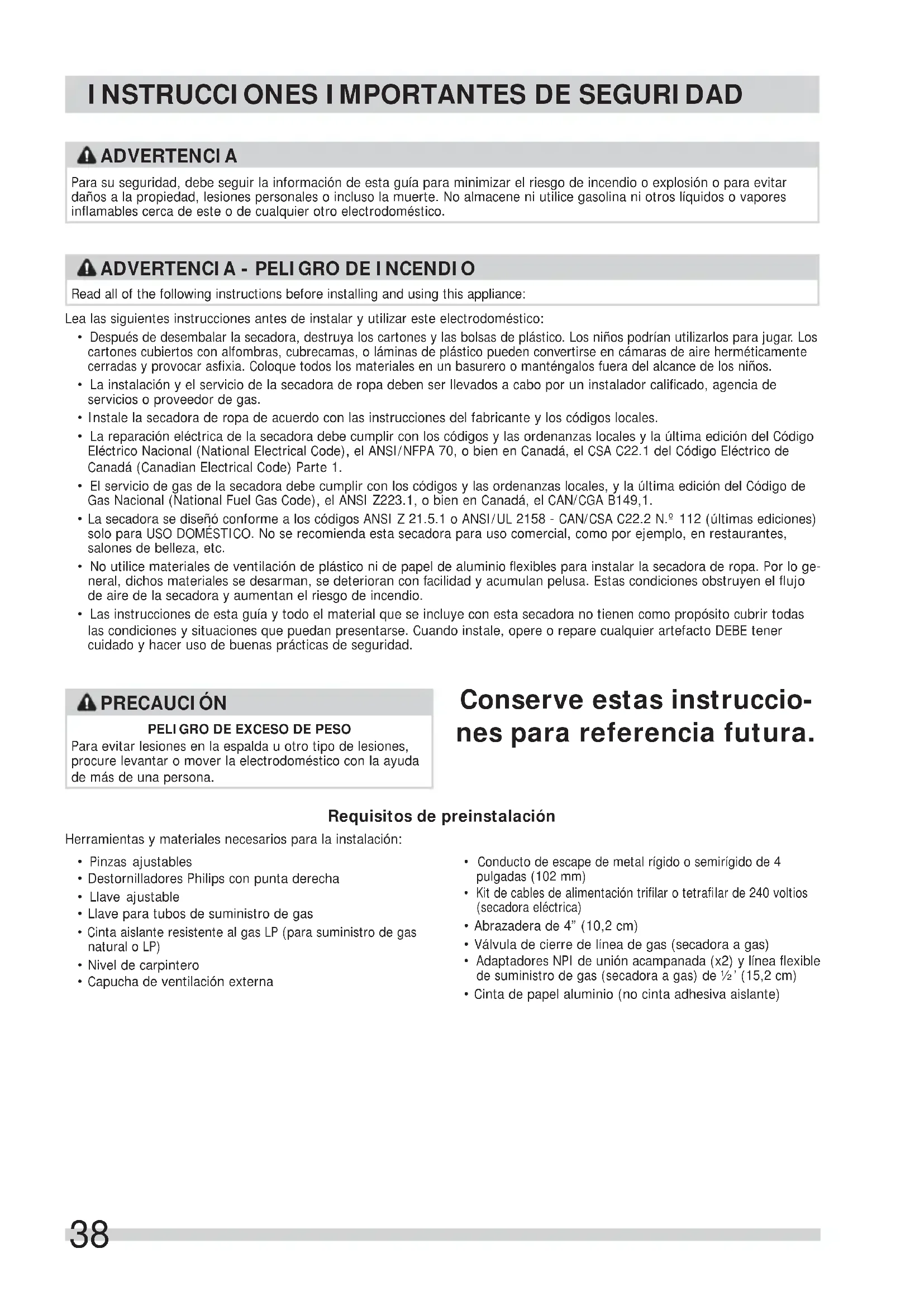Las instrucciones de esta guia y todo el material que se incluye con esta secadora noienen como proposto cubrir todas las conditiones y situaciones que pueda presentarse. Cuando instale, opere o reparerialquier artefacto DEBE tener cuidado y hacer uso de buena practicas de seguidad.
