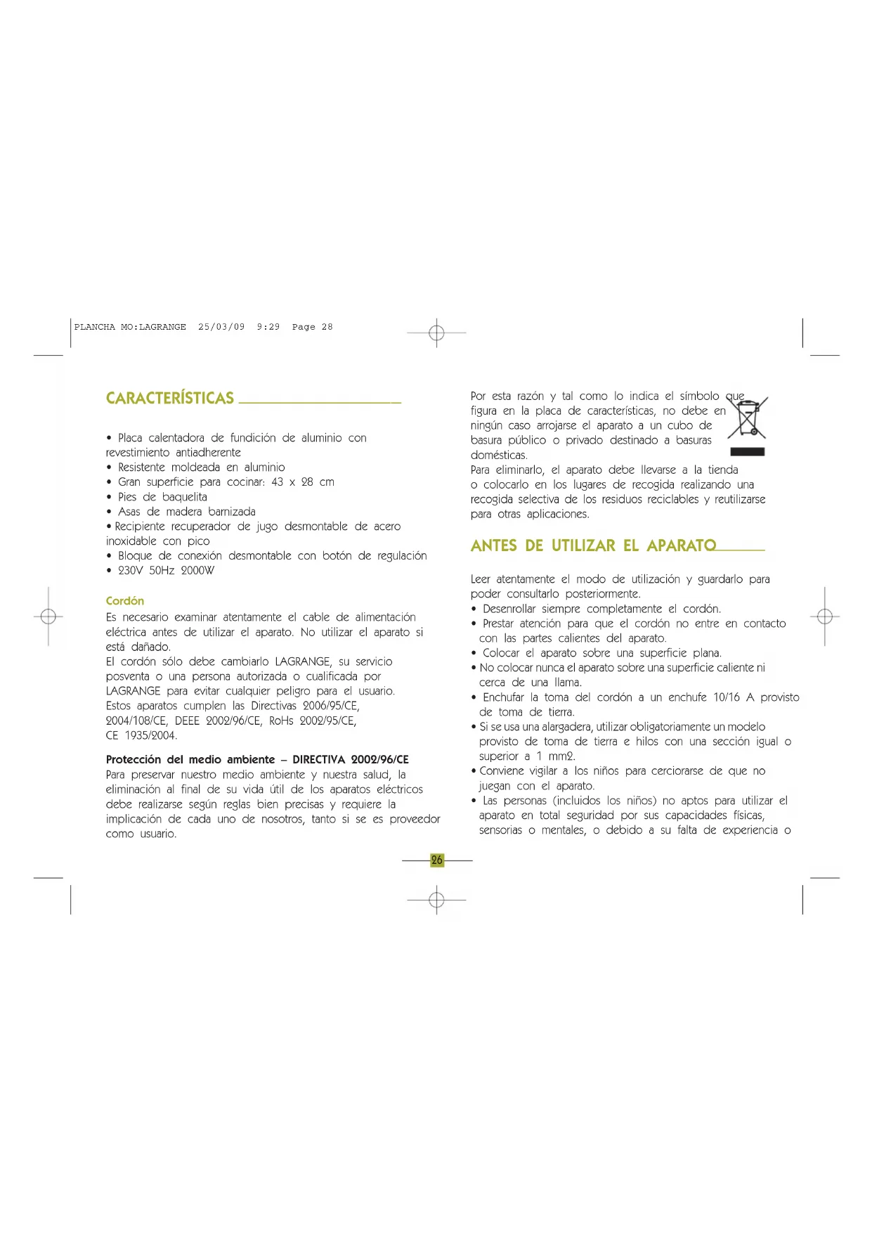 - 230V 50Hz 2000W Cordón Es necesario examinar atentamente el cable de alimentación eléctrica antes de utilizar el aparato. No utilizar el aparato si está dañado. El cordón sólo debe cambiarlo LAGRANGE, su servicio posventa o una persona autorizada o cualificada por LAGRANGE para evitar cualquier peligro para el usuario. Estos aparatos cumplen las Directivas 2006/95/CE, 2004/108/CE, DEEE 2002/96/CE, RoHs 2002/95/CE, CE 1935/2004. Protección del medio ambiente – DIRECTIVA 2002/96/CE Para preservar nuestro medio ambiente y nuestra salud, la eliminación al final de su vida útil de los aparatos eléctricos debe realizarse según reglas bien precisas y requiere la implicación de cada uno de nosotros, tanto si se es proveedor como usuario. Por esta razón y tal como lo indica el símbolo que figura en la placa de características, no debe en ningún caso arrojarse el aparato a un cubo de basura público o privado destinado a basuras domésticas. Para eliminarlo, el aparato debe llevarse a la tienda o colocarlo en los lugares de recogida realizando una recogida selectiva de los residuos reciclables y reutilizarse para otras aplicaciones.