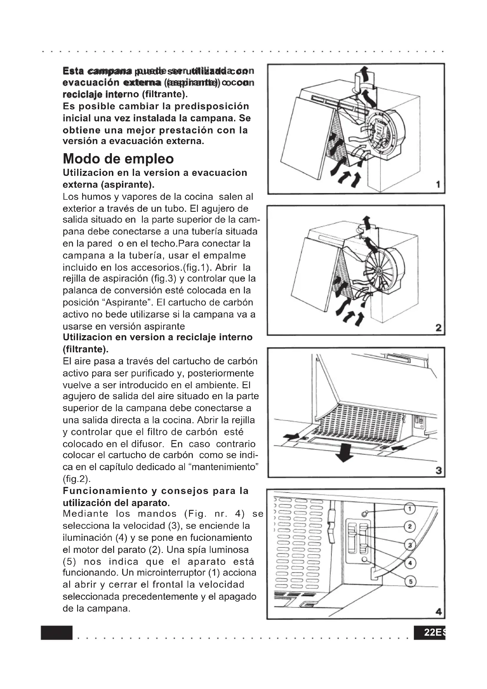 Para obtener un funcionamiento optimo del aparato se aconseja usar la velocidad mas alta en caso de fuertes concentraciones de vapores y olores, la segunda velocidad en condiciones normales y la primera velocidad para mentener el aire limpio con un escaso consumo eléctrico. Mantenimiento y limpieza del aparato Un mantenimiento constante garantiza un buen funcionamiento y un buen rendimiento. Las operaciones que deben realizarse para proceder al mantenimiento del filtro son las siguientes: Filtro antigrasa sintético (espesor 8/10 mm). Debe lavarse una vez al mes con agua templada y detergente sin escurrirlo. Dejarlo secar completamente antes de volver a mon- tarlo. Debe sustituirse cada seis lavados. Filtro antigrasa sintético sutil (espesor 1 mm). Debe sustituirse cada tres meses. ATENCION: este filtro no puede lavarse o regenerarse. Filtro antigrasa combinado (filtro sintético sutil + filtro metálico). El filtro sintético sutil debe sustituirse cada tres meses y no puede lavarse o regenerarse. El filtro metálico debe lavarse una vez al mes con agua templada y deter- gente teniendo cuidado de no doblarlo. Asegurarse de que esten bien secos antes de montarlos. Se recomineda, a la hora de realizar la limpieza o cambiar los filtros, seguir las instrucciones dadas para evitar posibles incendios. Para quitar el filtro antigrasa es indispensable abrir la rejilla de aspiración (Fig. nr. 3) y quitar las varillas que sujetan los filtros (Fig. nr. 5) Filtro de carbón vegetal activo Se encuantra tan solo en las campanas versión filtrante y tiene la función de retener los olores del aire que lo atraviesa; no debe lavarse, sino sustituirse cada tres meses. Para cambiarlo abrir la rejilla de aspiración, quitar el filtro desenroscando el pomo (Fig. nr. 6) Si se desea cambiar la bombilla abrir la rejilla. Usar siempre bombillas del mismo tipo y potencia. Importante La campana esta dotada de descarga a tierra segun las normas de seguridad internacionales. La distacia minima de seguridad entre el plano de cocción y la campana es de 65 cm. Controlar las freidoras durante su uso: el aceite demasiado caliente podría inflamarse. No cocinar con llamas altas debajo de la campana. No conectar el parato a tuberías de evacuación de humos causados por combustión (calderas, chimeneas, etc.).24ES ○○○○○○○○○○○○○○○○○○○○○○○○○○○○○○○○○○○○○○○ ○○○○○○○○○○○○○○○○○○○○○○○○○○○○○○○○○○○○○○○○○○○○○○○ Controlar que el voltaje de la red corresponda al indicado en la matrícula colocada en el interior de la campana. Antes de realizar cualquier tipo de limpieza, reparación o mantenimiento de la campana desenchufar el aparato. Fijación del panel frontal a la visera (Fig. 7) Quitar la visera girandola hacia adelante desblocando la sujeción situada a la izquierda de la campana. Agujerear el panel usando la corres-pondiente máscara, apoyar la visera sobre el panel de madera y sujetarla con tornillos D. 3,9x13 incluidos en los accesorios. Volver a montar la visera prestan- do atención a colocar las guias en sus sedes. Regular el movimiento de la visera median- te los dos tornillos V colocados en el interior de los cabezales. Fijación a los armarios de los laterales (Fig. 8). Agujerear los armarios usando la correspondiente mascara, sacar la visera y quitar la rejilla. Sujetar la campana a los armarios con los tornillos D. 3,5x16 mm incluidos en los accesorios apretandolos desde la parte interior de la campana. Fijación al muro (Fig. 9-10). Agujerear la pared usando la correspondiente mascara, colocar los tacos en los agujeros, sujetar las dos placas con los cuatro tornillos. Enganchar la campana en las placas. Los tacos, tornillos y placas estan incluidos en los accesorios. La cam- pana tiene en los angulos posteriores dos soportes extensibles y regulables que, junto a la escuadra inferior permiten alinear la cam- pana con los otros armarios.25 ○○○○○○○○○○○○○○○○○○○○○○○○○○○○○○○○○○○○○○○ ○○○○○○○○○○○○○○○○○○○○○○○○○○○○○○○○○○○○○○○○○○○○○○○