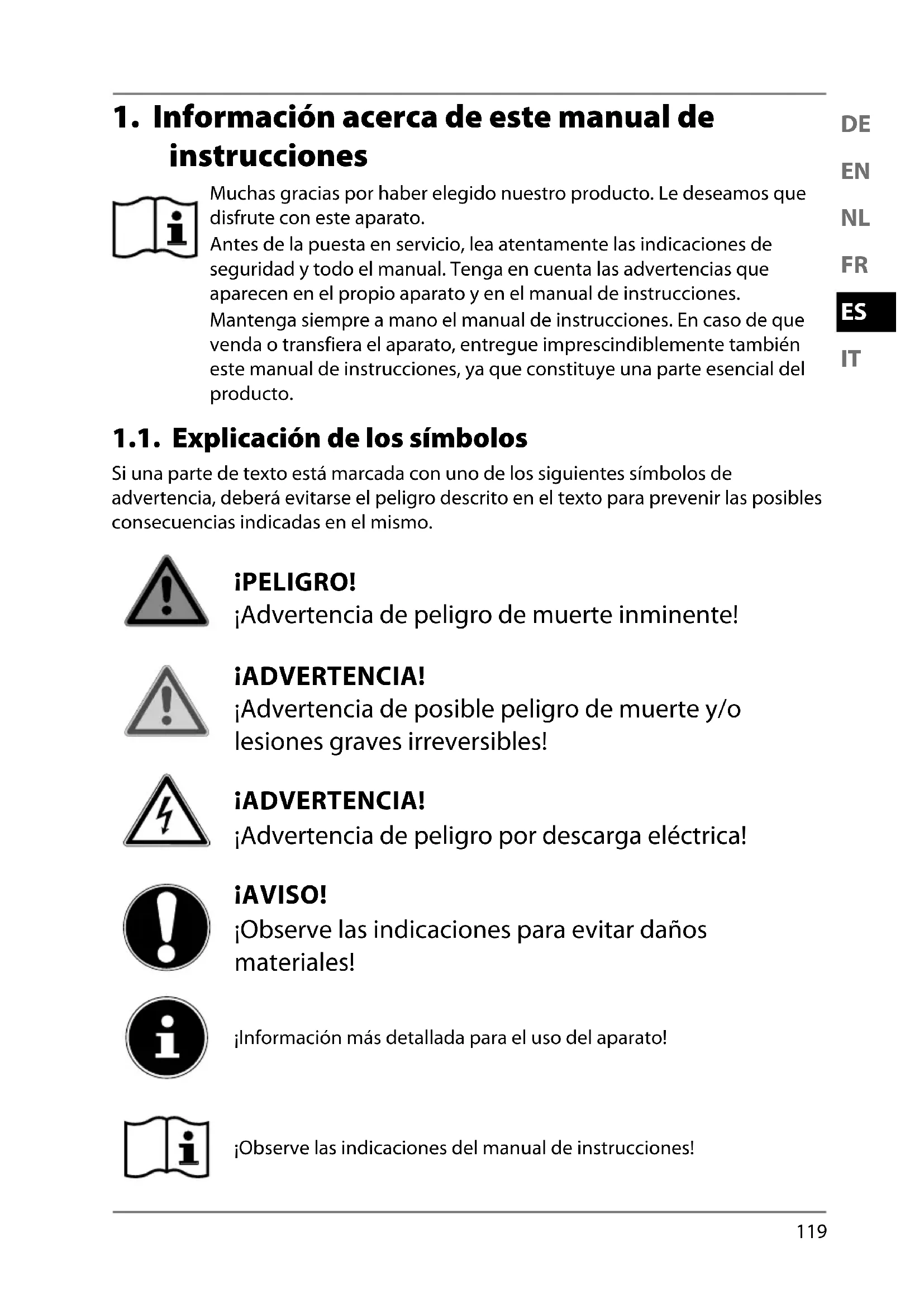 1. Información acerca de este manual de instrucciones ........................... 119