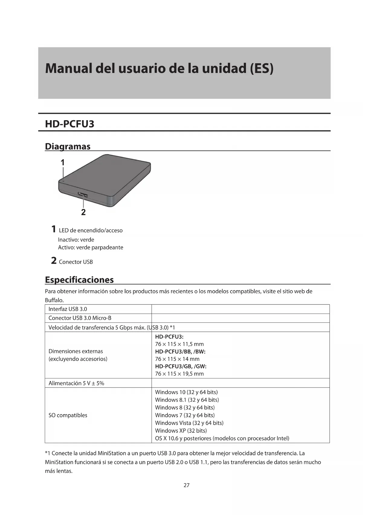 1 LED de encendido/acceso Inactivo: verde Activo: verde parpadeante 2 Conector USB Especificaciones Para obtener información sobre los productos más recientes o los modelos compatibles, visite el sitio web de Buffalo. Interfaz USB 3.0 Conector USB 3.0 Micro-B Velocidad de transferencia 5Gbps máx. (USB 3.0) *1 Dimensiones externas (excluyendo accesorios) HD-PCFU3: 76 × 115 × 11,5 mm HD-PCFU3/BB, /BW: 76 × 115 × 14 mm HD-PCFU3/GB, /GW: 76 × 115 × 19,5 mm Alimentación 5V ± 5% SO compatibles Windows 10 (32 y 64bits) Windows 8.1 (32 y 64bits) Windows 8 (32 y 64bits) Windows 7 (32 y 64bits) Windows Vista (32 y 64bits) Windows XP (32bits) OS X 10.6 y posteriores (modelos con procesador Intel) *1 Conecte la unidad MiniStation a un puerto USB 3.0 para obtener la mejor velocidad de transferencia. La MiniStation funcionará si se conecta a un puerto USB 2.0 o USB 1.1, pero las transferencias de datos serán mucho más lentas.28 HD-PUSU3 Diagramas