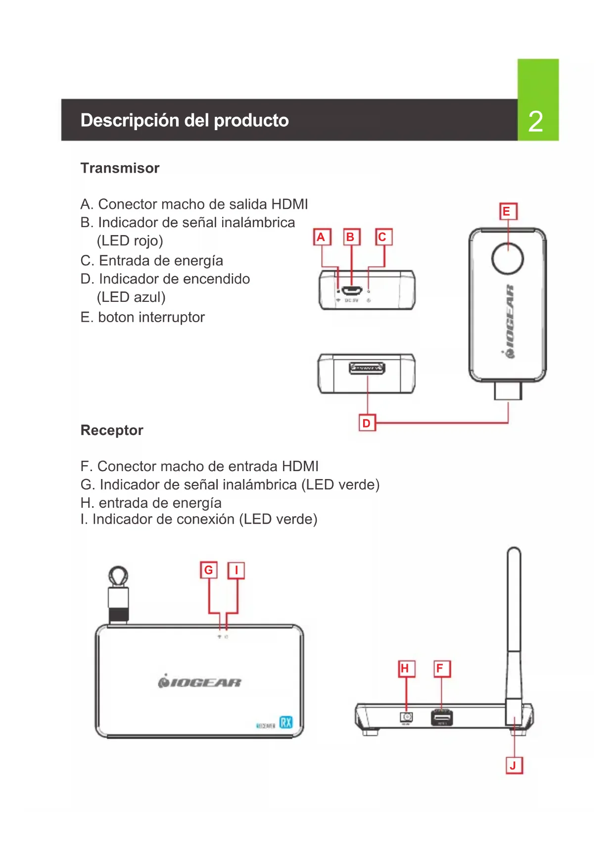 Transmisor A. Conector macho de salida HDMI B. Indicador de señal inalámbrica (LED rojo) C. Entrada de energía D. Indicador de encendido (LED azul) E. boton interruptor Receptor F. Conector macho de entrada HDMI G. Indicador de señal inalámbrica (LED verde) H. entrada de energía