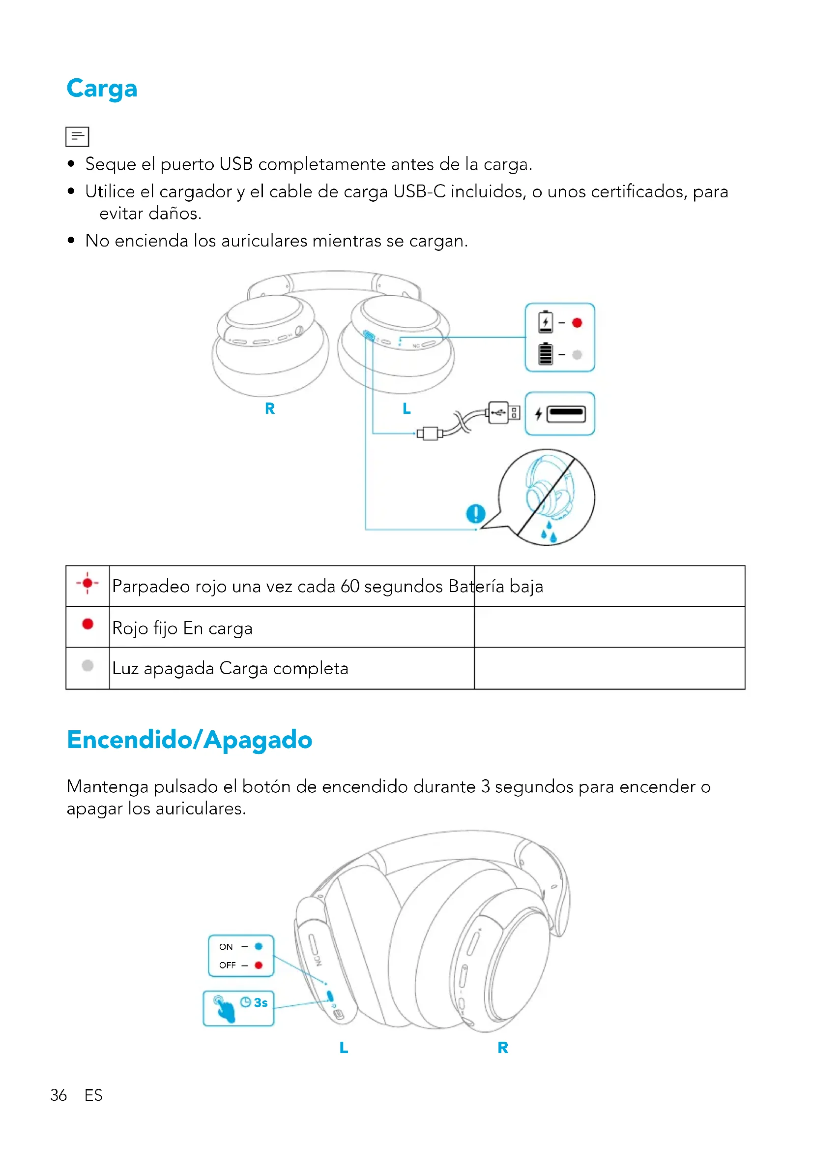 - No encienda los auriculares mientras se cargan. R L Parpadeo rojo una vez cada 60 segundos Batería baja Rojo jo En carga Luz apagada Carga completa Encendido/Apagado Mantenga pulsado el botón de encendido durante 3 segundos para encender o apagar los auriculares.