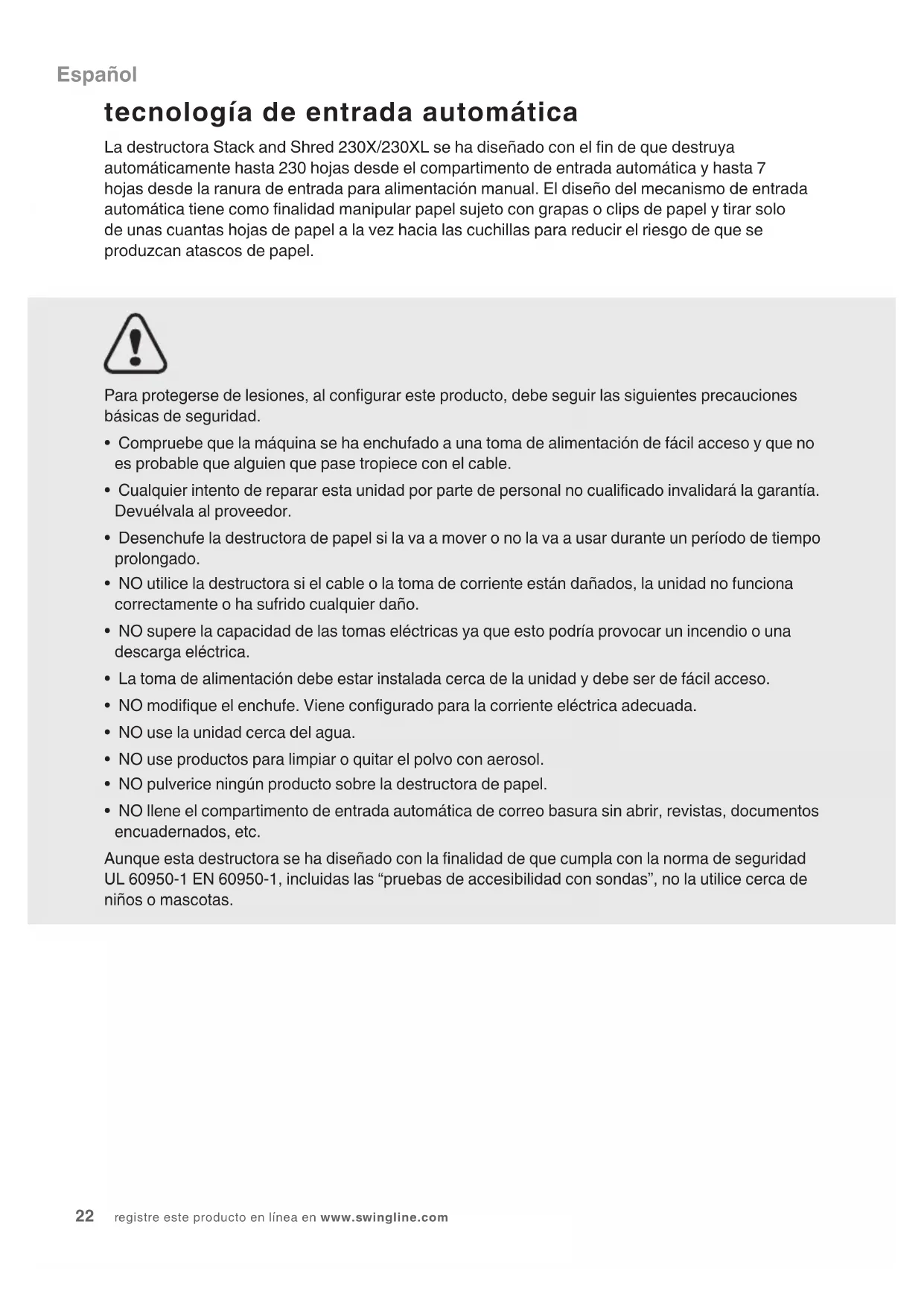 - NO llene el compartimento de entrada automática de correo basura sin abrir, revistas, documentos encuadernados, etc. Aunque esta destructora se ha diseñado con la nalidad de que cumpla con la norma de seguridad UL 60950-1 EN 60950-1, incluidas las “pruebas de accesibilidad con sondas”, no la utilice cerca de niños o mascotas. tecnología de entrada automática La destructora Stack and Shred 230X/230XL se ha diseñado con el n de que destruya automáticamente hasta 230 hojas desde el compartimento de entrada automática y hasta 7 hojas desde la ranura de entrada para alimentación manual. El diseño del mecanismo de entrada automática tiene como nalidad manipular papel sujeto con grapas o clips de papel y tirar solo de unas cuantas hojas de papel a la vez hacia las cuchillas para reducir el riesgo de que se produzcan atascos de papel. EspañolSTACK-AND-SHRED 230X&230XL