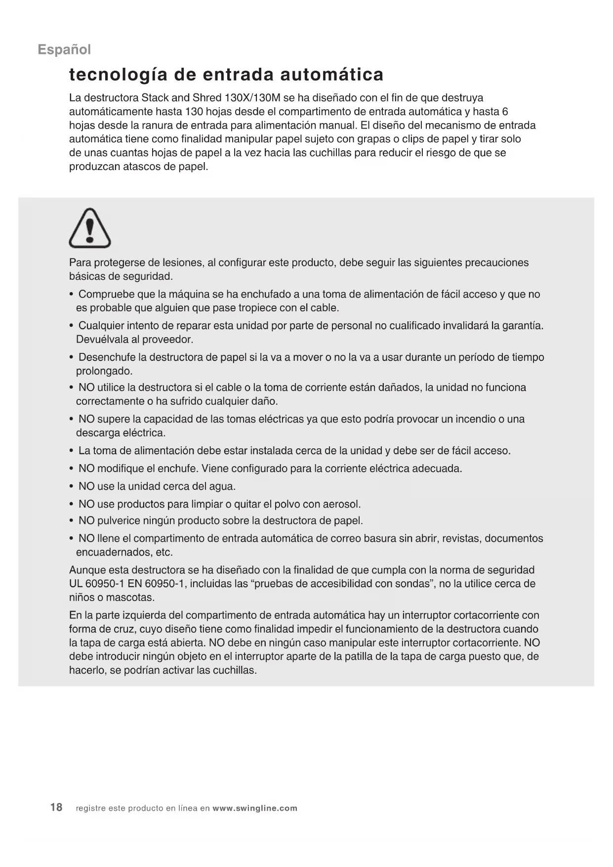 - NO llene el compartimento de entrada automática de correo basura sin abrir, revistas, documentos encuadernados, etc. Aunque esta destructora se ha diseñado con la nalidad de que cumpla con la norma de seguridad UL 60950-1 EN 60950-1, incluidas las “pruebas de accesibilidad con sondas”, no la utilice cerca de niños o mascotas. En la parte izquierda del compartimento de entrada automática hay un interruptor cortacorriente con forma de cruz, cuyo diseño tiene como nalidad impedir el funcionamiento de la destructora cuando la tapa de carga está abierta. NO debe en ningún caso manipular este interruptor cortacorriente. NO debe introducir ningún objeto en el interruptor aparte de la patilla de la tapa de carga puesto que, de hacerlo, se podrían activar las cuchillas. tecnología de entrada automática La destructora Stack and Shred 130X/130M se ha diseñado con el n de que destruya automáticamente hasta 130 hojas desde el compartimento de entrada automática y hasta 6 hojas desde la ranura de entrada para alimentación manual. El diseño del mecanismo de entrada automática tiene como nalidad manipular papel sujeto con grapas o clips de papel y tirar solo de unas cuantas hojas de papel a la vez hacia las cuchillas para reducir el riesgo de que se produzcan atascos de papel. EspañolSTACK-AND-SHRED 130X&130M