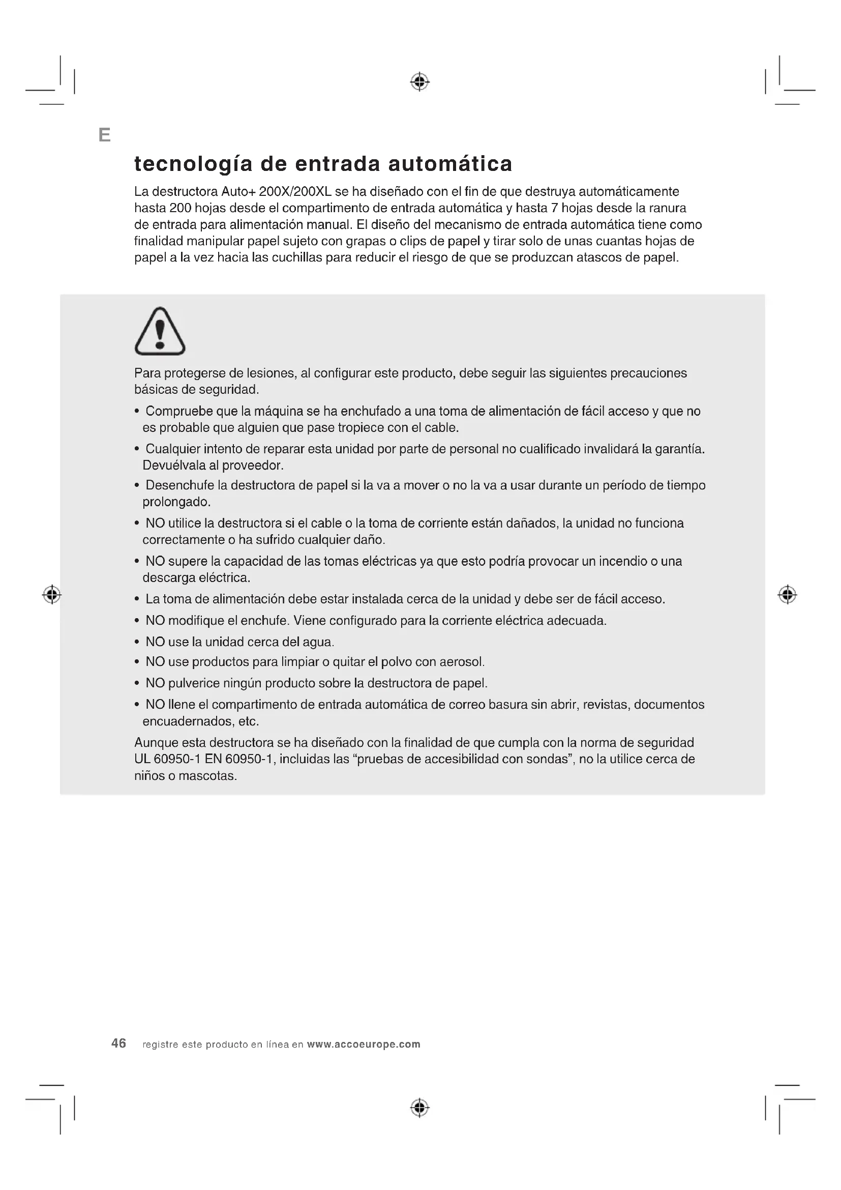 - NO llene el compartimento de entrada automática de correo basura sin abrir, revistas, documentos encuadernados, etc. Aunque esta destructora se ha diseñado con la nalidad de que cumpla con la norma de seguridad UL 60950-1 EN 60950-1, incluidas las “pruebas de accesibilidad con sondas”, no la utilice cerca de niños o mascotas. tecnología de entrada automática La destructora Auto+ 200X/200XL se ha diseñado con el n de que destruya automáticamente hasta 200 hojas desde el compartimento de entrada automática y hasta 7 hojas desde la ranura de entrada para alimentación manual. El diseño del mecanismo de entrada automática tiene como nalidad manipular papel sujeto con grapas o clips de papel y tirar solo de unas cuantas hojas de papel a la vez hacia las cuchillas para reducir el riesgo de que se produzcan atascos de papel.AUTO+ 200X&200XL