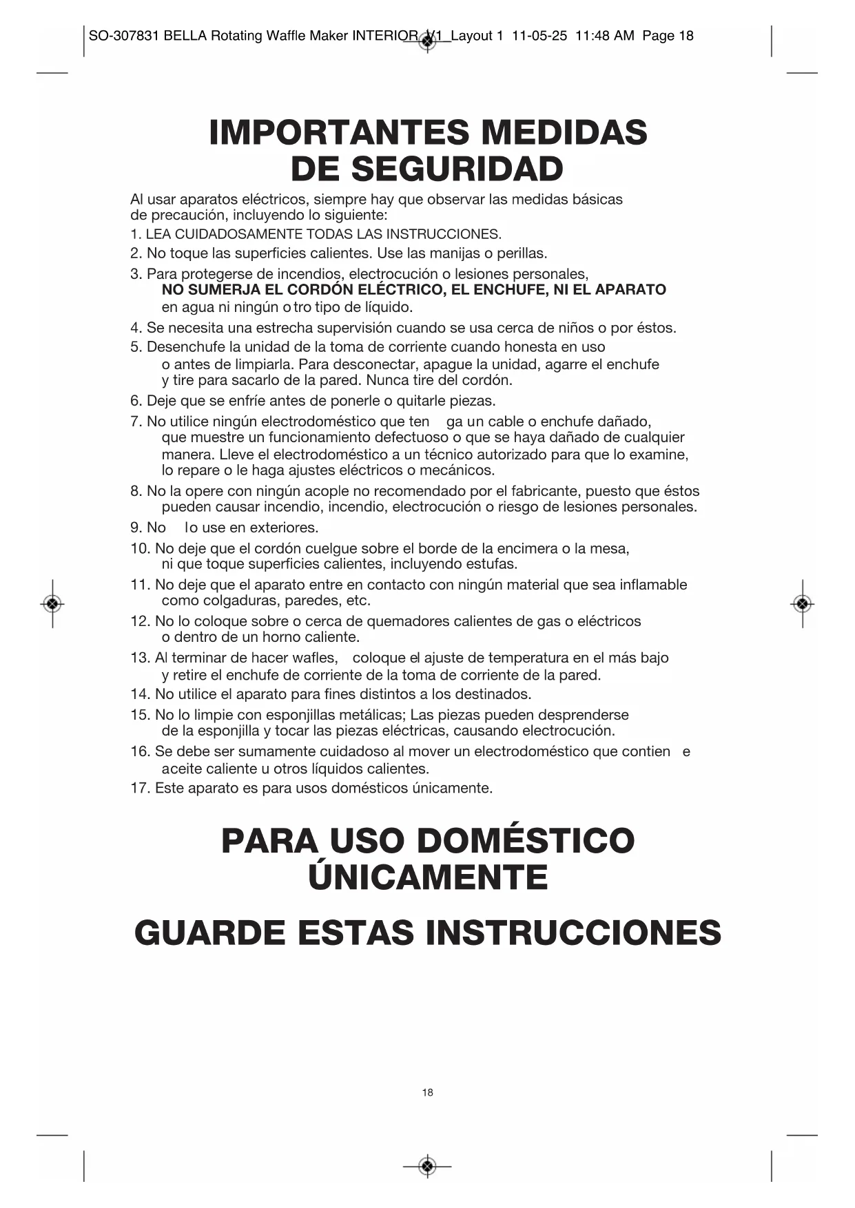 SO-307831 BELLA Rotating Waffle Maker INTERIOR_V1_Layout 1 11-05-25 11:48 AM Page 17IMPORTANTES MEDIDAS DE SEGURIDAD Al usar aparatos eléctricos, siempre hay que observar las medidas básicas de precaución, incluyendo lo siguiente: