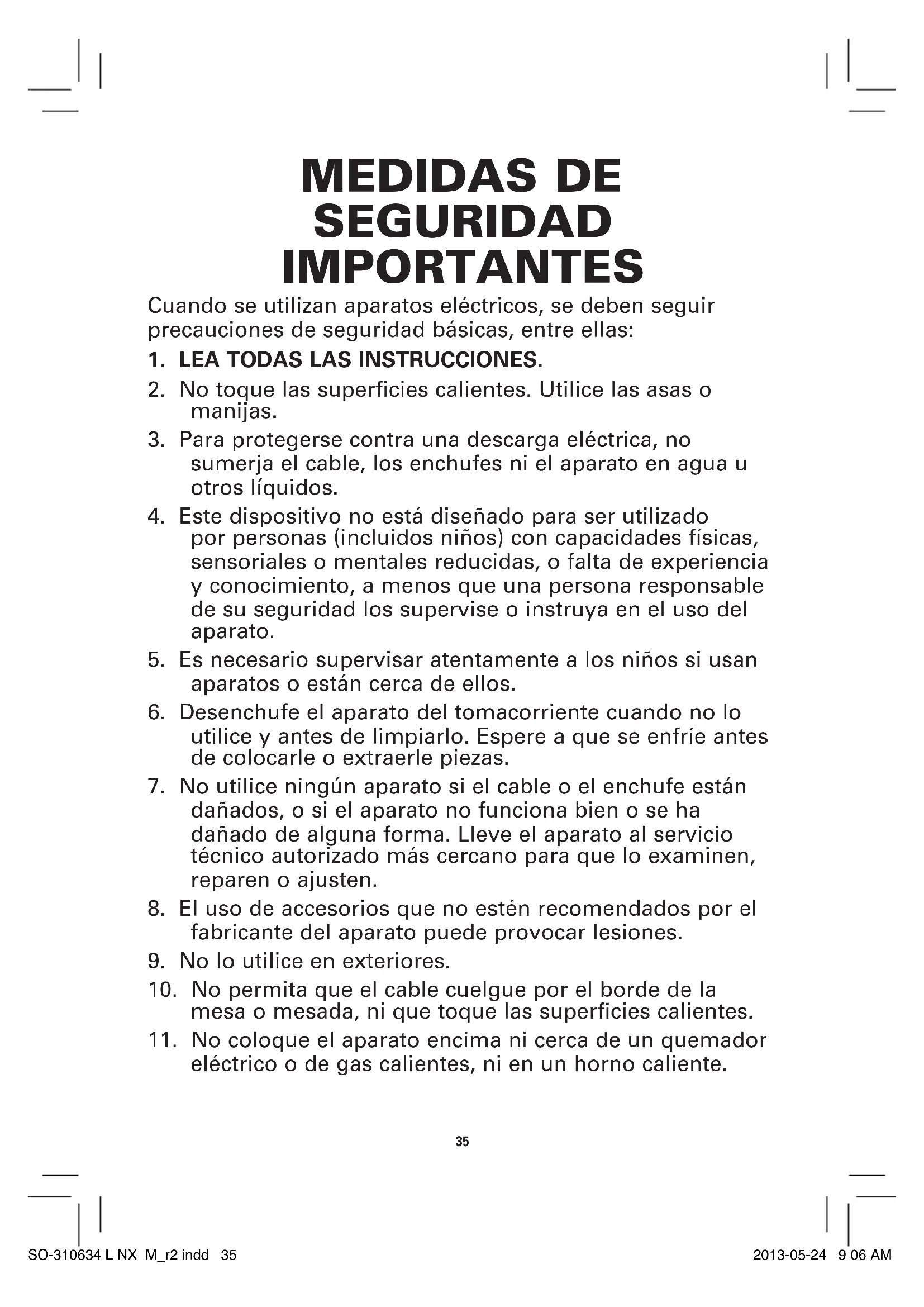 ÚNICAMENTE SO-310634 L NX M_r2 indd 36 2013-05-24 9 06 AM37 OTRAS MEDIDAS DE SEGURIDAD IMPORTANTES PRECAUCIÓN CON LAS SUPERFICIES CALIENTES: Este aparato genera calor y vapor de escape durante el uso. Se deben tomar las medidas necesarias para evitar riesgos de quemaduras, incendios u otras lesiones a personas o daño a la propiedad.