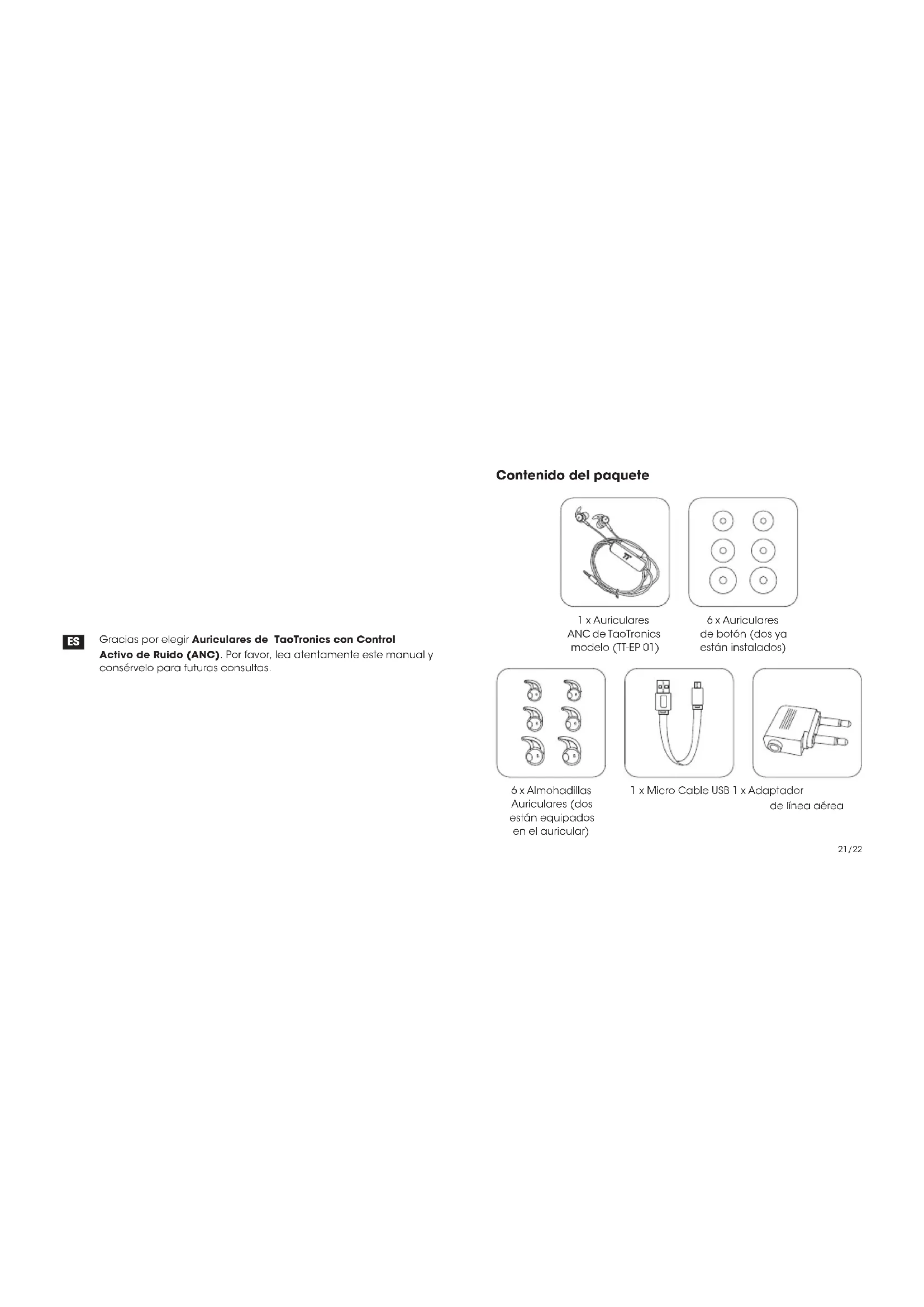 Contenido del paquete 1 x Auriculares ANC de TaoTronics modelo (TT-EP 01) 6 x Almohadillas Auriculares (dos están equipados en el auricular) 1 x Micro Cable USB 1 x Adaptador de línea aérea 6 x Auriculares de botón (dos ya están instalados) 21/22①