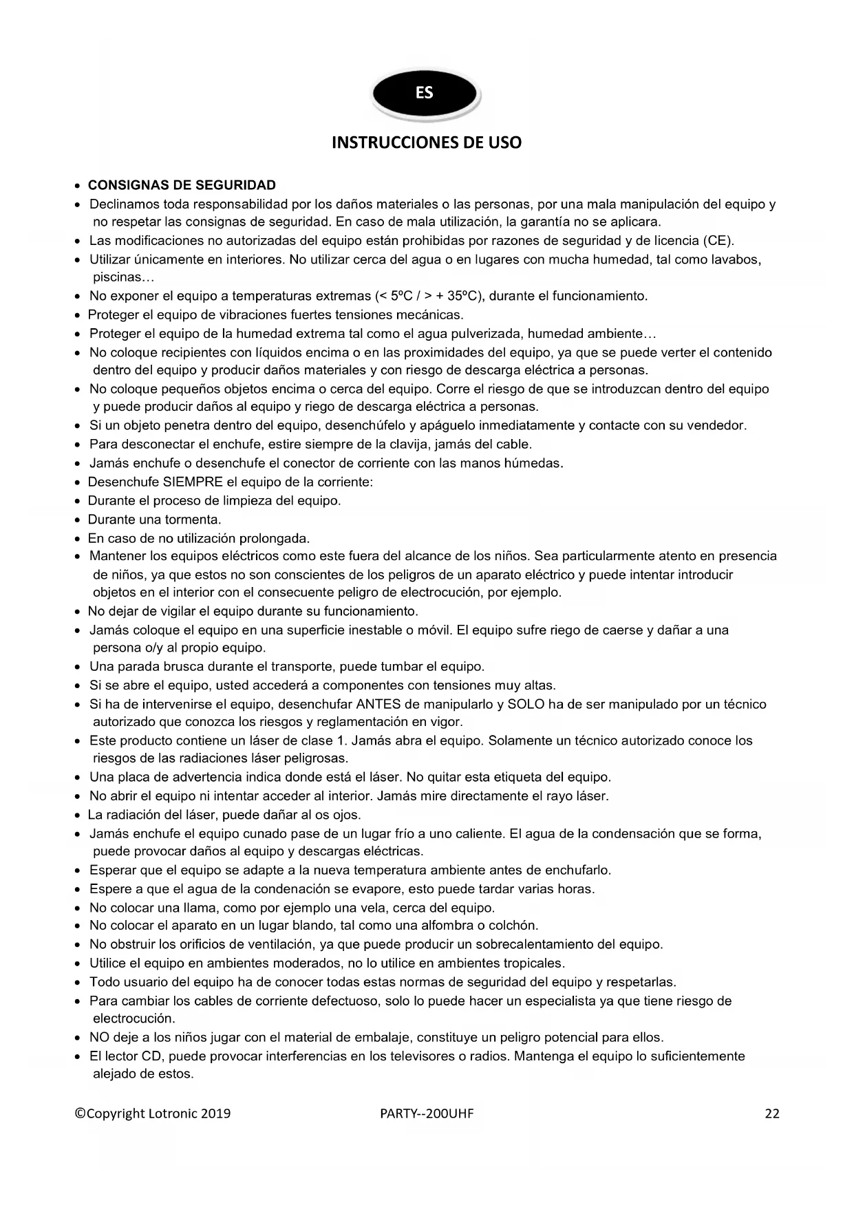 - El lector CD, puede provocar interferencias en los televisores o radios. Mantenga el equipo lo suficientemente alejado de estos. ES©Copyright Lotronic 2019 PARTY--200UHF 23