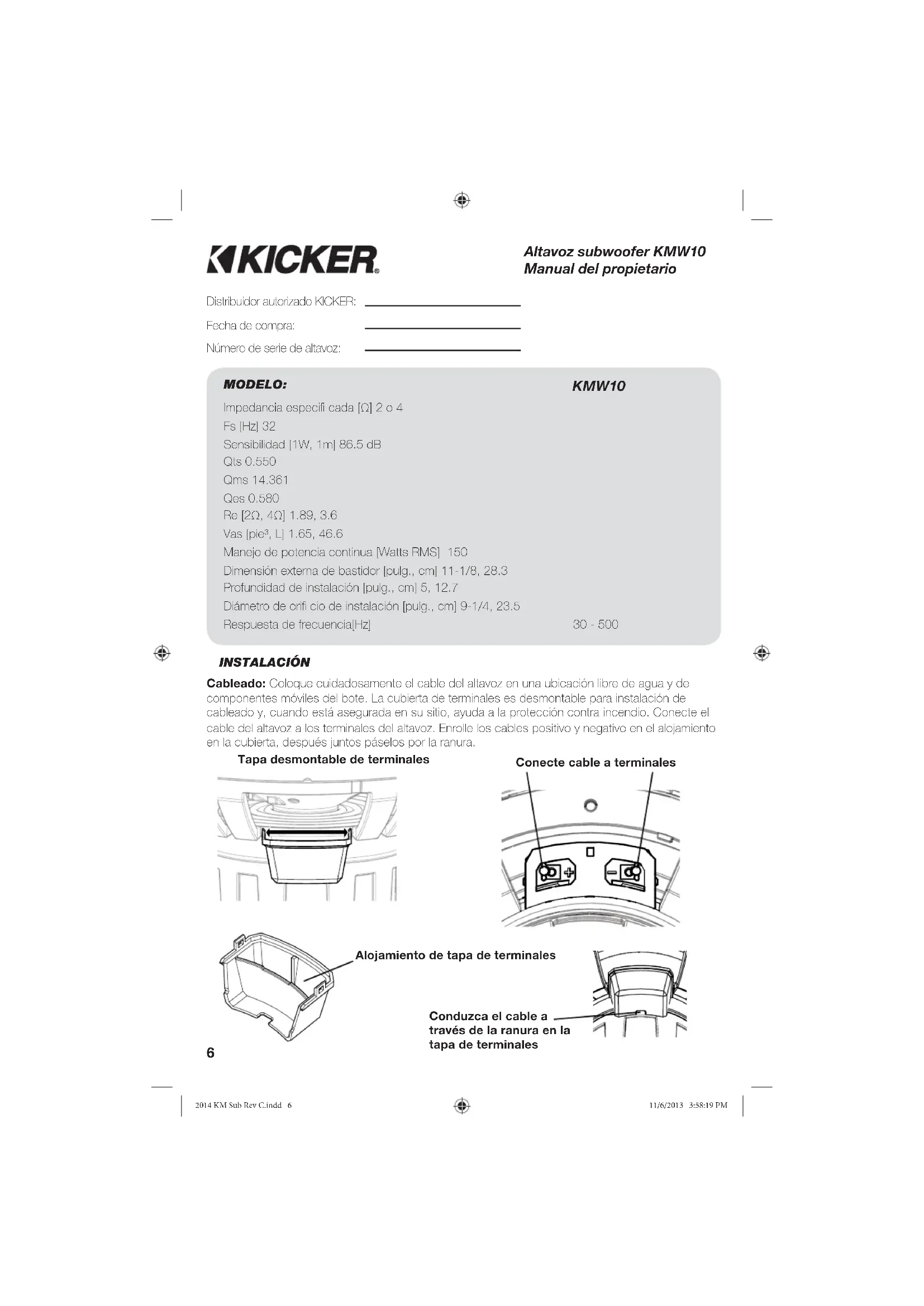Para la informacion mais actual, visle www.kicker.com. Para obtener el mayor rendimiento de su nuevo alvatoz Subwooer KICKER, le recomendamos user accesos y cabido originales KICKER. Sivase esperar dos semanas de ajuste para que el atavoz Subwooer alcance su cesepejo optimo. El uso de un fttro subscnico augmentar signil catvamente el maneo de potencia. Las espacitaciones de maneo de potencia en estas tablas estan calculadas en base a un ftro subscnico de 25Hz, 24dB por octava.