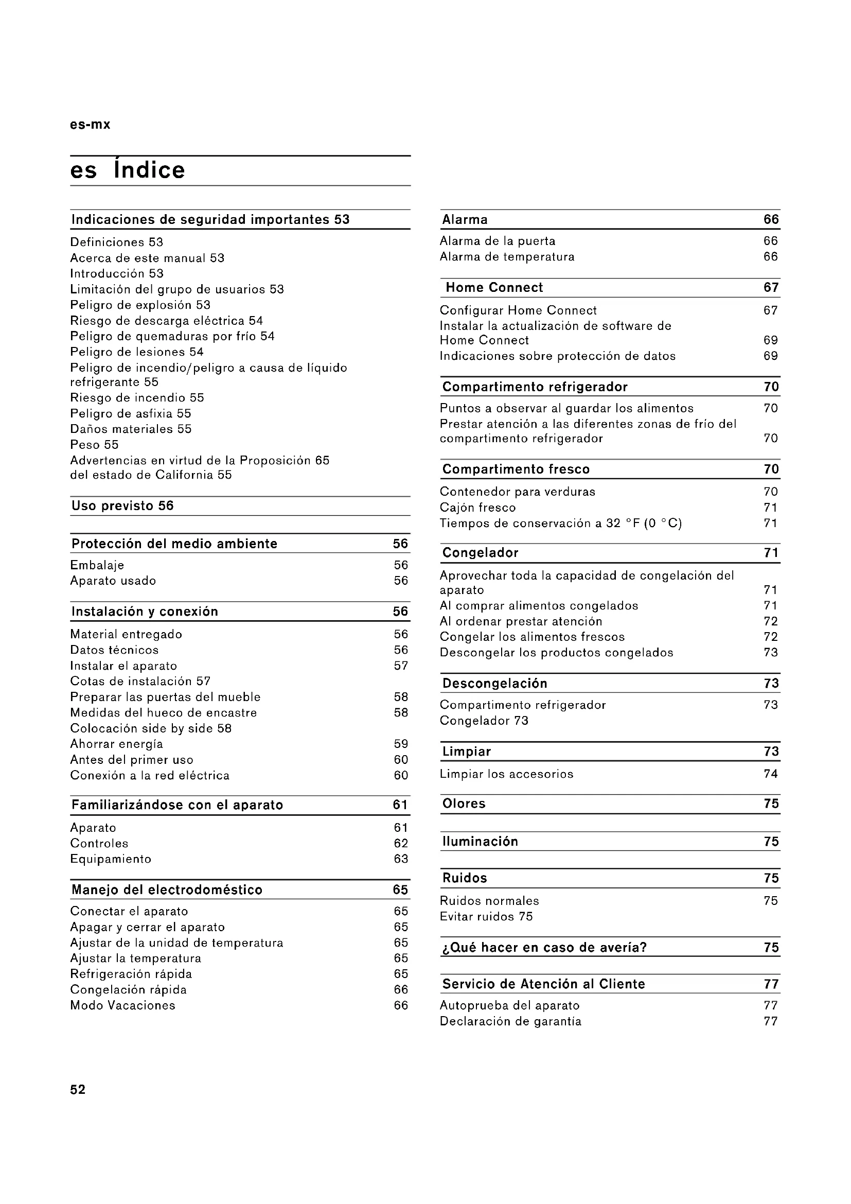 Indicaciones de seguridad importantes 53 Definiciones 53 Acerca de este manual 53 Introducción 53 Limitación del grupo de usuarios 53 Peligro de explosión 53 Riesgo de descarga eléctrica 54 Peligro de quemaduras por frío 54 Peligro de lesiones 54 Peligro de incendio/peligro a causa de líquido refrigerante 55 Riesgo de incendio 55 Peligro de asfixia 55 Daños materiales 55 Peso 55 Advertencias en virtud de la Proposición 65 del estado de California 55