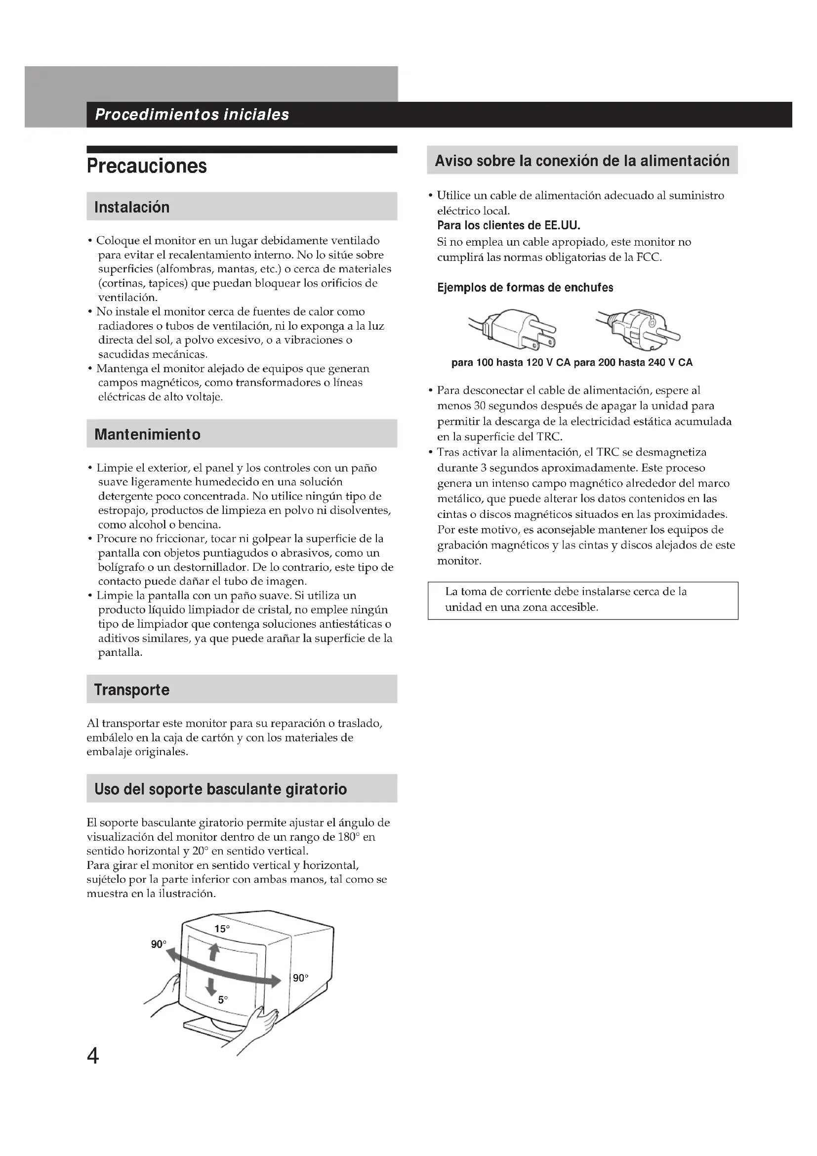 - Tras activar la alimentación, el TRC se desmagnetiza durante 3 segundos aproximadamente. Este proceso genera un intenso campo magnético alrededor del marco metálico, que puede alterar los datos contenidos en las cintas o discos magnéticos situados en las proximidades. Por este motivo, es aconsejable mantener los equipos de grabación magnéticos y las cintas y discos alejados de este monitor. La toma de corriente debe instalarse cerca de la unidad en una zona accesible. para 100 hasta 120 V CA para 200 hasta 240 V CA Procedimientos iniciales 90° 90° 15°