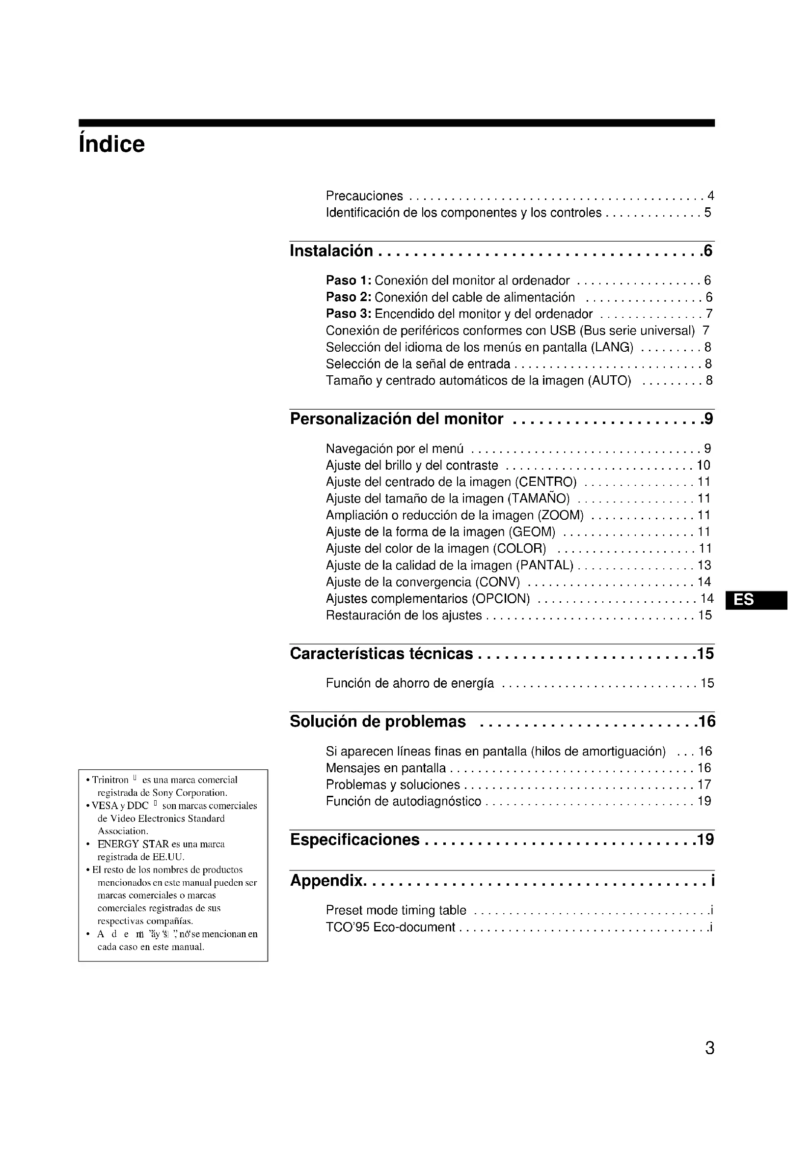 Precauciones . . . . . . . . . . . . . . . . . . . . . . . . . . . . . . . . . . . . . . . . . . 4 Identificación de los componentes y los controles . . . . . . . . . . . . . . 5 Instalación . . . . . . . . . . . . . . . . . . . . . . . . . . . . . . . . . . . . .6 Paso 1: Conexión del monitor al ordenador . . . . . . . . . . . . . . . . . . 6 Paso 2: Conexión del cable de alimentación . . . . . . . . . . . . . . . . . 6 Paso 3: Encendido del monitor y del ordenador . . . . . . . . . . . . . . . 7 Conexión de periféricos conformes con USB (Bus serie universal) 7 Selección del idioma de los menús en pantalla (LANG) . . . . . . . . . 8 Selección de la señal de entrada . . . . . . . . . . . . . . . . . . . . . . . . . . . 8 Tamaño y centrado automáticos de la imagen (AUTO) . . . . . . . . . 8 Personalización del monitor . . . . . . . . . . . . . . . . . . . . . .9 Navegación por el menú . . . . . . . . . . . . . . . . . . . . . . . . . . . . . . . . . 9 Ajuste del brillo y del contraste . . . . . . . . . . . . . . . . . . . . . . . . . . . 10 Ajuste del centrado de la imagen (CENTRO) . . . . . . . . . . . . . . . . 11 Ajuste del tamaño de la imagen (TAMAÑO) . . . . . . . . . . . . . . . . . 11 Ampliación o reducción de la imagen (ZOOM) . . . . . . . . . . . . . . . 11 Ajuste de la forma de la imagen (GEOM) . . . . . . . . . . . . . . . . . . . 11 Ajuste del color de la imagen (COLOR) . . . . . . . . . . . . . . . . . . . . 11 Ajuste de la calidad de la imagen (PANTAL) . . . . . . . . . . . . . . . . . 13 Ajuste de la convergencia (CONV) . . . . . . . . . . . . . . . . . . . . . . . . 14 Ajustes complementarios (OPCION) . . . . . . . . . . . . . . . . . . . . . . . 14 Restauración de los ajustes . . . . . . . . . . . . . . . . . . . . . . . . . . . . . . 15 Características técnicas . . . . . . . . . . . . . . . . . . . . . . . . .15 Función de ahorro de energía . . . . . . . . . . . . . . . . . . . . . . . . . . . . 15 Solución de problemas . . . . . . . . . . . . . . . . . . . . . . . . .16 Si aparecen líneas finas en pantalla (hilos de amortiguación) . . . 16 Mensajes en pantalla . . . . . . . . . . . . . . . . . . . . . . . . . . . . . . . . . . . 16 Problemas y soluciones . . . . . . . . . . . . . . . . . . . . . . . . . . . . . . . . . 17 Función de autodiagnóstico . . . . . . . . . . . . . . . . . . . . . . . . . . . . . . 19 Especificaciones . . . . . . . . . . . . . . . . . . . . . . . . . . . . . . .19 Appendix. . . . . . . . . . . . . . . . . . . . . . . . . . . . . . . . . . . . . . . i Preset mode timing table . . . . . . . . . . . . . . . . . . . . . . . . . . . . . . . . . .i TCO’95 Eco-document . . . . . . . . . . . . . . . . . . . . . . . . . . . . . . . . . . . .i4 Precauciones Advertencia sobre las conexiones de alimentación Utilice un cable de alimentación apropiado para el suministro eléctrico local.