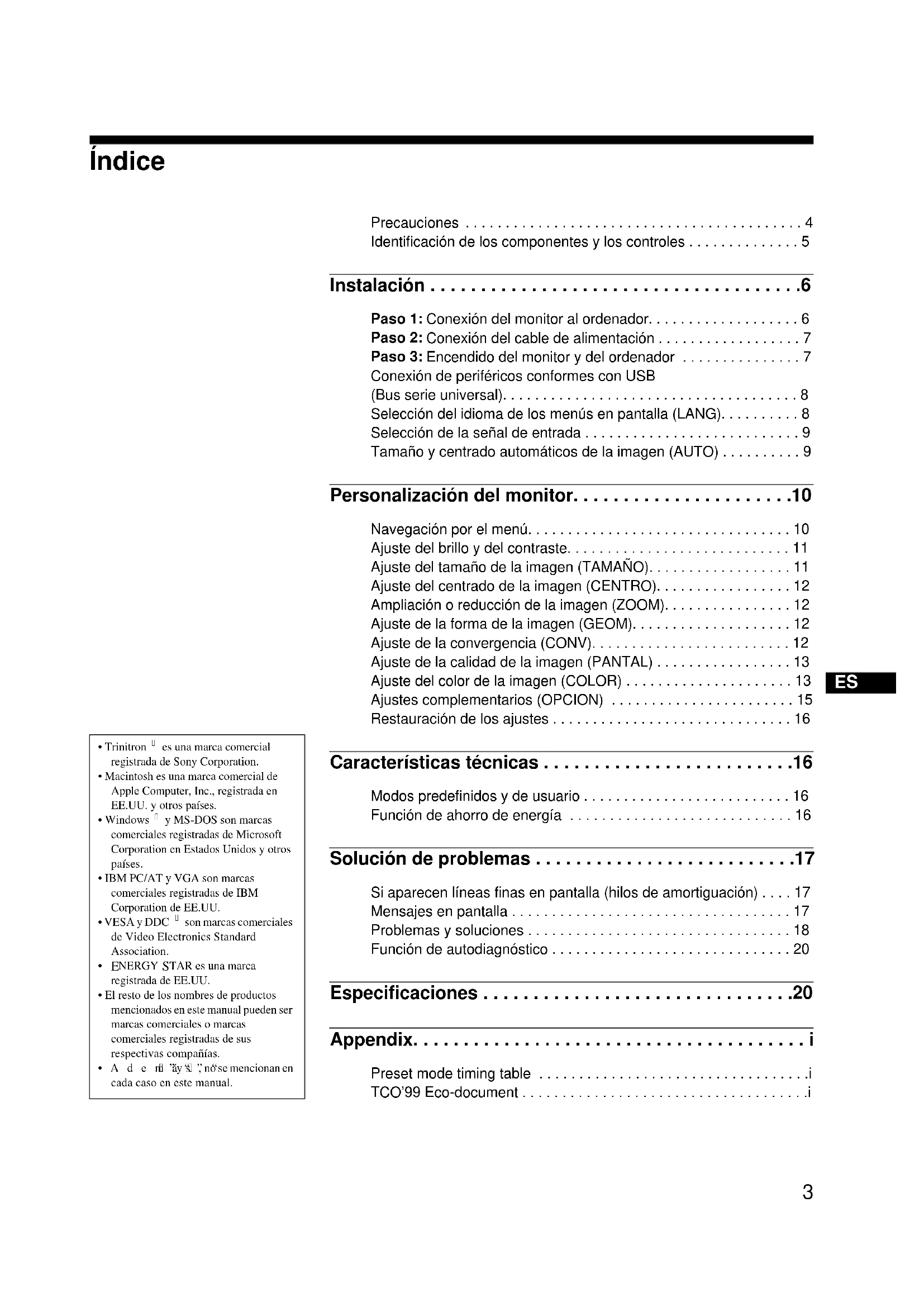 Precauciones . . . . . . . . . . . . . . . . . . . . . . . . . . . . . . . . . . . . . . . . . . 4 Identificación de los componentes y los controles . . . . . . . . . . . . . . 5 Instalación . . . . . . . . . . . . . . . . . . . . . . . . . . . . . . . . . . . . .6 Paso 1: Conexión del monitor al ordenador. . . . . . . . . . . . . . . . . . . 6 Paso 2: Conexión del cable de alimentación . . . . . . . . . . . . . . . . . . 7 Paso 3: Encendido del monitor y del ordenador . . . . . . . . . . . . . . . 7 Conexión de periféricos conformes con USB (Bus serie universal). . . . . . . . . . . . . . . . . . . . . . . . . . . . . . . . . . . . . 8 Selección del idioma de los menús en pantalla (LANG). . . . . . . . . . 8 Selección de la señal de entrada . . . . . . . . . . . . . . . . . . . . . . . . . . . 9 Tamaño y centrado automáticos de la imagen (AUTO) . . . . . . . . . . 9 Personalización del monitor. . . . . . . . . . . . . . . . . . . . . .10 Navegación por el menú. . . . . . . . . . . . . . . . . . . . . . . . . . . . . . . . . 10 Ajuste del brillo y del contraste. . . . . . . . . . . . . . . . . . . . . . . . . . . . 11 Ajuste del tamaño de la imagen (TAMAÑO). . . . . . . . . . . . . . . . . . 11 Ajuste del centrado de la imagen (CENTRO). . . . . . . . . . . . . . . . . 12 Ampliación o reducción de la imagen (ZOOM). . . . . . . . . . . . . . . . 12 Ajuste de la forma de la imagen (GEOM). . . . . . . . . . . . . . . . . . . . 12 Ajuste de la convergencia (CONV). . . . . . . . . . . . . . . . . . . . . . . . . 12 Ajuste de la calidad de la imagen (PANTAL) . . . . . . . . . . . . . . . . . 13 Ajuste del color de la imagen (COLOR) . . . . . . . . . . . . . . . . . . . . . 13 Ajustes complementarios (OPCION) . . . . . . . . . . . . . . . . . . . . . . . 15 Restauración de los ajustes . . . . . . . . . . . . . . . . . . . . . . . . . . . . . . 16 Características técnicas . . . . . . . . . . . . . . . . . . . . . . . . .16 Modos predefinidos y de usuario . . . . . . . . . . . . . . . . . . . . . . . . . . 16 Función de ahorro de energía . . . . . . . . . . . . . . . . . . . . . . . . . . . . 16 Solución de problemas . . . . . . . . . . . . . . . . . . . . . . . . . .17 Si aparecen líneas finas en pantalla (hilos de amortiguación) . . . . 17 Mensajes en pantalla . . . . . . . . . . . . . . . . . . . . . . . . . . . . . . . . . . . 17 Problemas y soluciones . . . . . . . . . . . . . . . . . . . . . . . . . . . . . . . . . 18 Función de autodiagnóstico . . . . . . . . . . . . . . . . . . . . . . . . . . . . . . 20 Especificaciones . . . . . . . . . . . . . . . . . . . . . . . . . . . . . . .20 Appendix. . . . . . . . . . . . . . . . . . . . . . . . . . . . . . . . . . . . . . . i Preset mode timing table . . . . . . . . . . . . . . . . . . . . . . . . . . . . . . . . . .i TCO’99 Eco-document . . . . . . . . . . . . . . . . . . . . . . . . . . . . . . . . . . . .i4 Precauciones Advertencia sobre las conexiones de alimentación