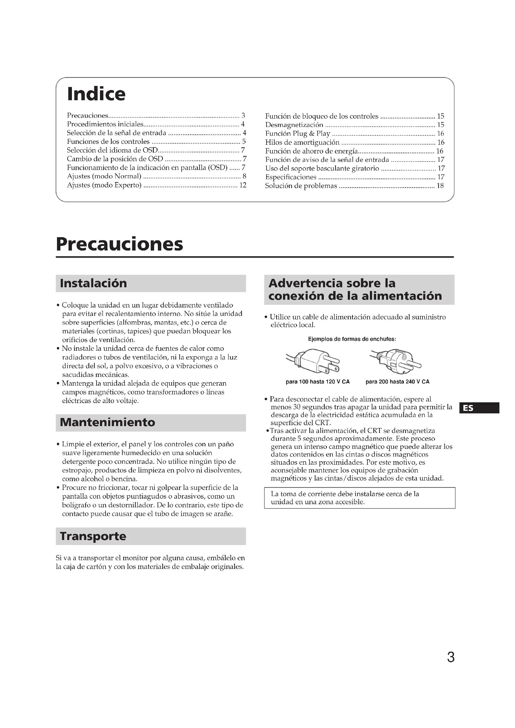 - Tras activar la alimentación, el CRT se desmagnetiza durante 5 segundos aproximadamente. Este proceso genera un intenso campo magnético que puede alterar los datos contenidos en las cintas o discos magnéticos situados en las proximidades. Por este motivo, es aconsejable mantener los equipos de grabación magnéticos y las cintas/discos alejados de esta unidad. La toma de corriente debe instalarse cerca de la unidad en una zona accesible. Ejemplos de formas de enchufes:para 200 hasta 240 V CApara 100 hasta 120 V CA4 Paso 2: Conecte el cable de alimentación. Con el monitor apagado, conecte a éste un extremo del cable de alimentación adecuado al suministro eléctrico local y el otro extremo a la toma de corriente. Paso 3: Active el monitor y el ordenador. Paso 4: Si es necesario, ajuste los controles de usuario según sus preferencias. La instalación está finalizada. Disfrute del monitor. Procedimientos iniciales Antes de utilizar este monitor, asegúrese de que en el paquete se incluyen los siguientes artículos: