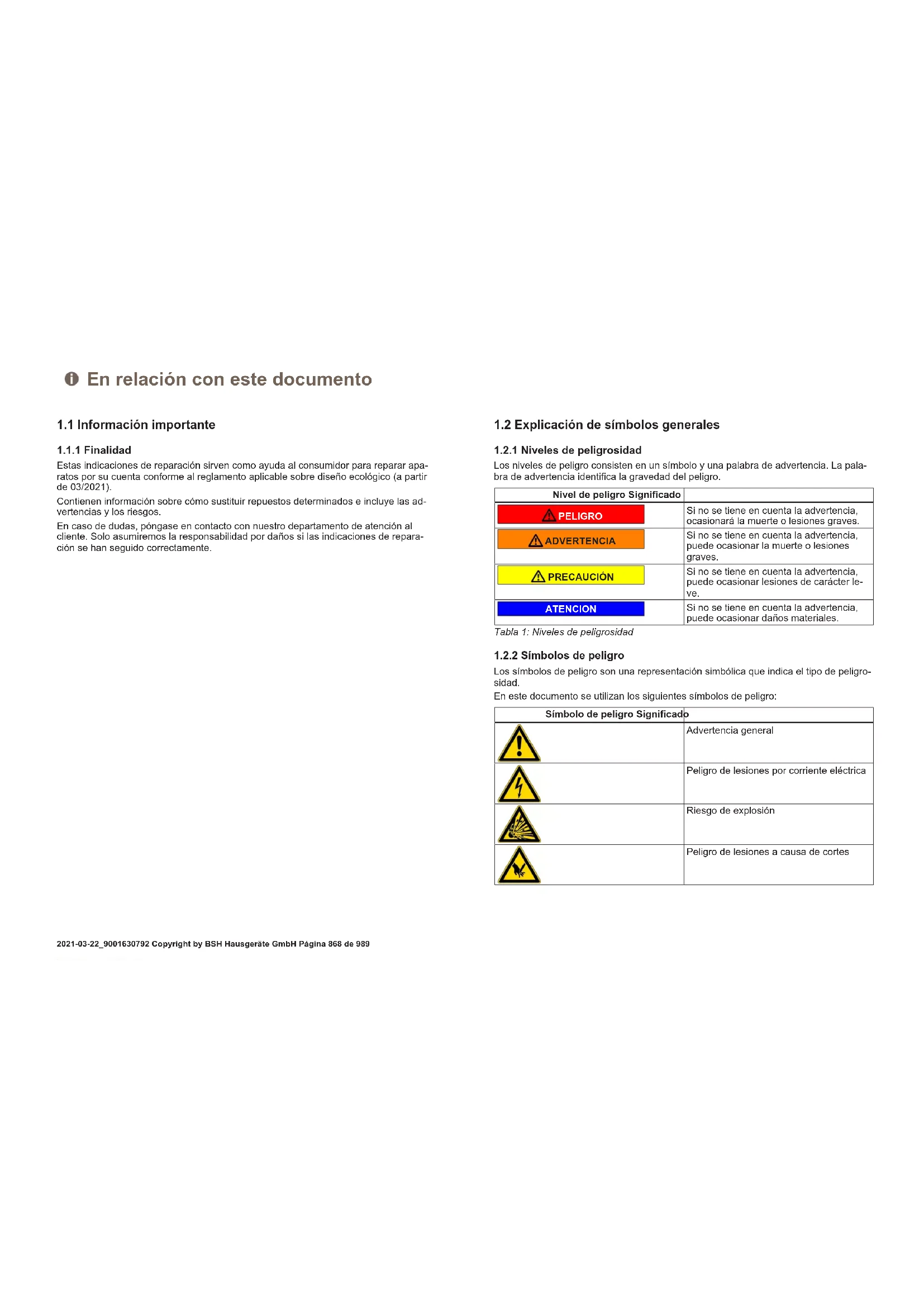 Los símbolos de peligro son una representación simbólica que indica el tipo de peligro- sidad. En este documento se utilizan los siguientes símbolos de peligro: Símbolo de peligro Significado Advertencia general Peligro de lesiones por corriente eléctrica Riesgo de explosión Peligro de lesiones a causa de cortes En relación con este documento 2021-03-22_9001630792 Copyright by BSH Hausgeräte GmbH Página868de989Símbolo de peligro Significado Peligro de lesiones por aplastamiento Peligro de lesiones por superficies calien- tes Peligro a causa de campos magnéticos de gran potencia Peligro derivado de radiación no ionizante Tabla2: Símbolos de peligro