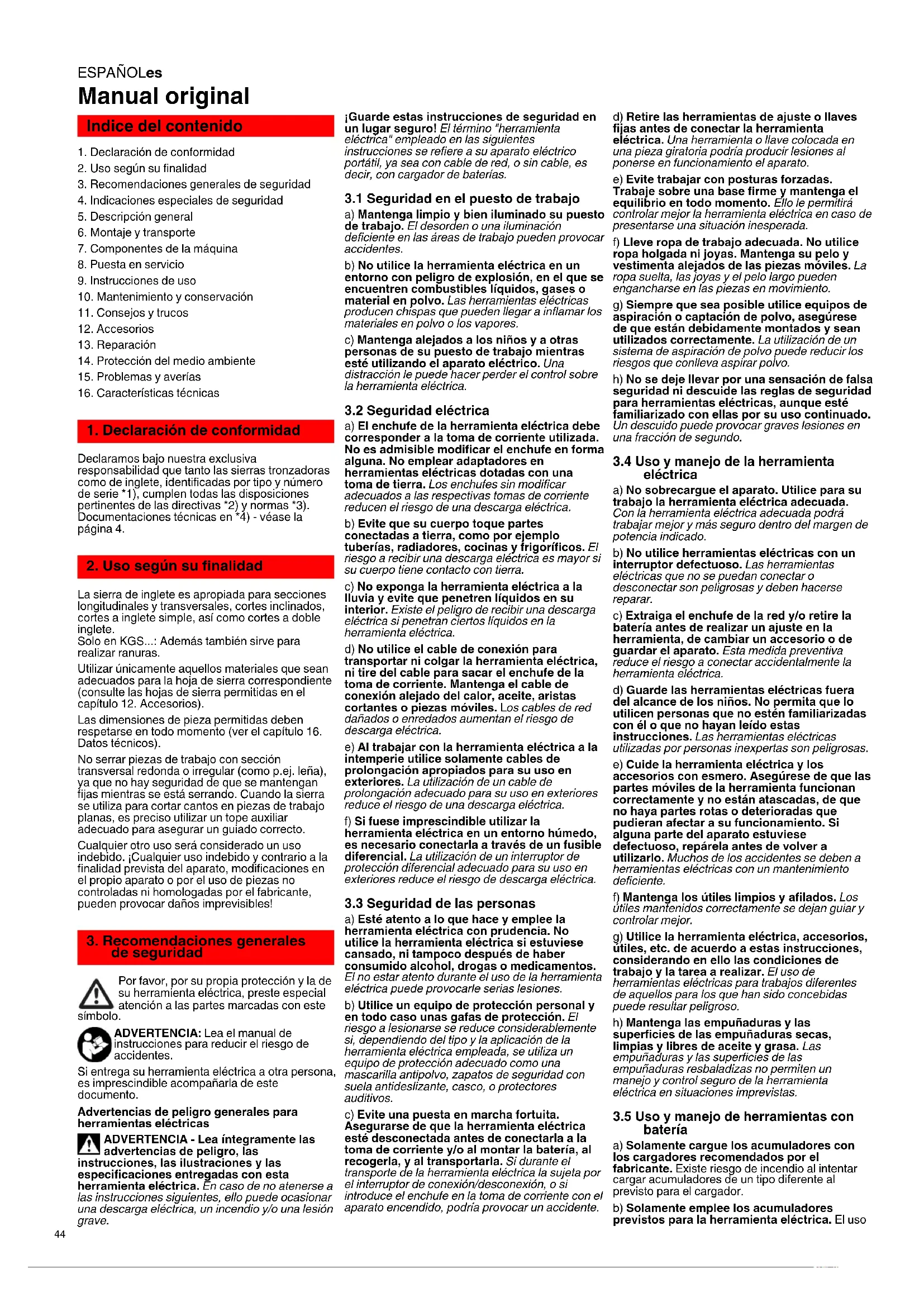 Declaramos bajo nuestra exclusiva responsabilidad que tanto las sierras tronzadoras como de inglete, identificadas por tipo y número de serie *1), cumplen todas las disposiciones pertinentes de las directivas *2) y normas *3). Documentaciones técnicas en *4) - véase la página 4. La sierra de inglete es apropiada para secciones longitudinales y transversales, cortes inclinados, cortes a inglete simple, así como cortes a doble inglete. Solo en KGS...: Además también sirve para realizar ranuras. Utilizar únicamente aquellos materiales que sean adecuados para la hoja de sierra correspondiente (consulte las hojas de sierra permitidas en el capítulo 12. Accesorios). Las dimensiones de pieza permitidas deben respetarse en todo momento (ver el capítulo 16. Datos técnicos). No serrar piezas de trabajo con sección transversal redonda o irregular (como p.ej. leña), ya que no hay seguridad de que se mantengan fijas mientras se está serrando. Cuando la sierra se utiliza para cortar cantos en piezas de trabajo planas, es preciso utilizar un tope auxiliar adecuado para asegurar un guiado correcto. Cualquier otro uso será considerado un uso indebido. ¡Cualquier uso indebido y contrario a la finalidad prevista del aparato, modificaciones en el propio aparato o por el uso de piezas no controladas ni homologadas por el fabricante, pueden provocar daños imprevisibles! Por favor, por su propia protección y la de su herramienta eléctrica, preste especial atención a las partes marcadas con este símbolo. ADVERTENCIA: Lea el manual de instrucciones para reducir el riesgo de accidentes. Si entrega su herramienta eléctrica a otra persona, es imprescindible acompañarla de este documento. Advertencias de peligro generales para herramientas eléctricas ADVERTENCIA - Lea íntegramente las advertencias de peligro, las instrucciones, las ilustraciones y las especificaciones entregadas con esta herramienta eléctrica. En caso de no atenerse a las instrucciones siguientes, ello puede ocasionar una descarga eléctrica, un incendio y/o una lesión grave. ¡Guarde estas instrucciones de seguridad en un lugar seguro! El término "herramienta eléctrica" empleado en las siguientes instrucciones se refiere a su aparato eléctrico portátil, ya sea con cable de red, o sin cable, es decir, con cargador de baterías.