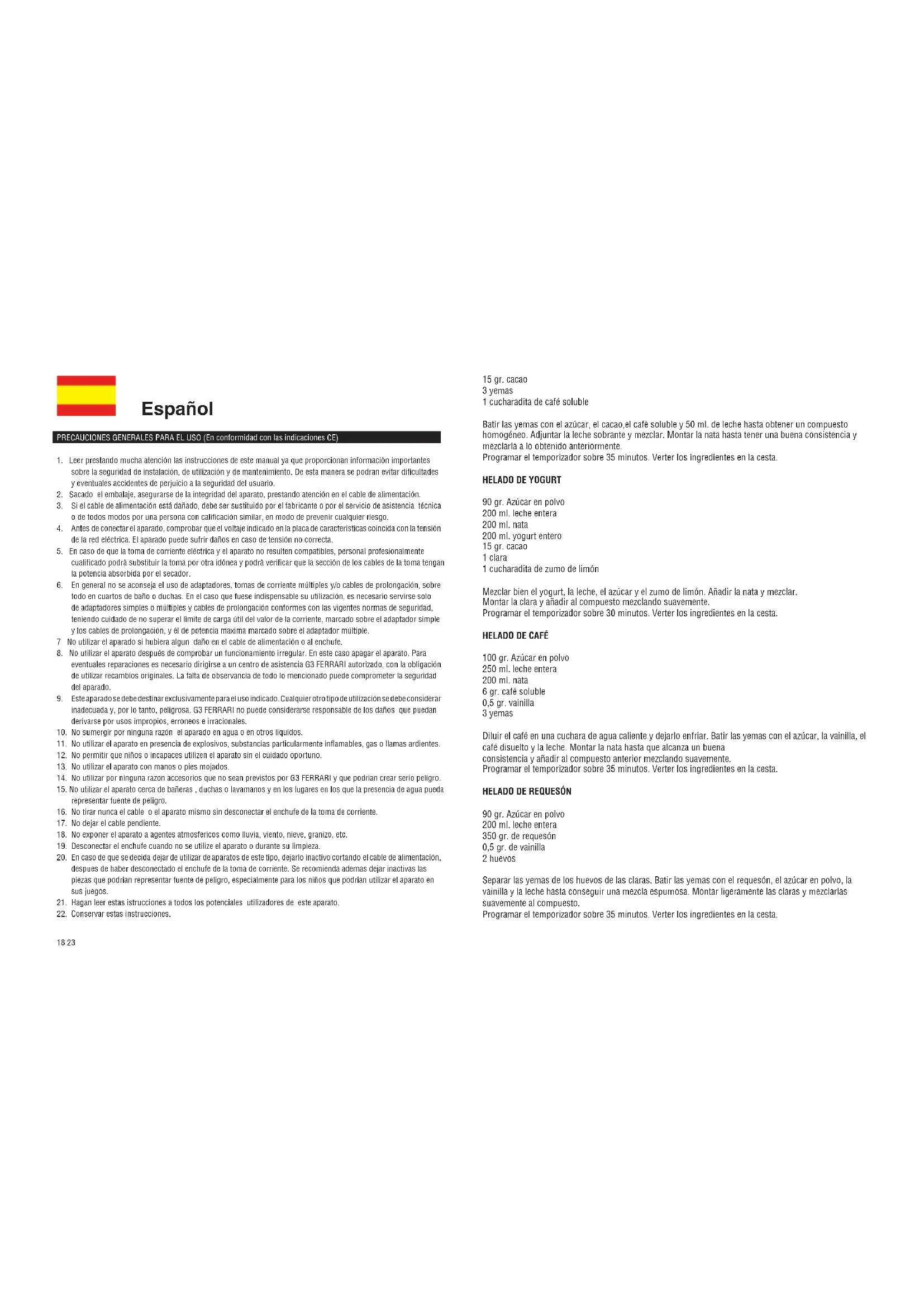 100 grs. of powdered sugar 250 mls. of whole milk 200 mls. of whipped cream 15 grs. of cocoa 3 yolks 1 teaspoon of instant coffee Whip the yolks with the sugar, the cocoa, the instant coffee and 50 mls. of milk till getting a homoge- neous mixture. Add the remaining milk and mix. Whip the cream up to when it reaches a good consisten- ce and add it to the mixture gotten before. Set the timer on 35 minutes. Pour the ingredients in the bowl.CONDICIONES DE GARANTIA G3 FERRARI ESPAÑA S.L. concede para este aparato un periodo de garantía de 24 meses de duración. En el caso de que el aparato requiera una reparación durante este periodo tenemos a su disposición una red de servicios técnicos autorizados en el ámbito nacional. El articulo a reparar debe llegar integro a nuestros centros de asistencia, cualquier manipulación por parte del comprador, uso inadecuado, caída o por una utilización no doméstica invalidará la garantía. La garantía cubrirá la reparación totalmente gratuita de los vicios o defectos originarios y de los daños y perjuicios por ellos ocasionados. Así como, si la reparación no fuese satisfactoria y el aparato no cumpliese las condiciones óptimas para su uso al cual va a ser destinado, el titular de la garantía tendrá derecho a la sustitución del mismo por otro de idénticas características o la devolución el importe pagado. Este aparato tiene derecho a la garantía sin tener que enviar nada. El usuario debe sólo conservar el presente certicado de garantía para entregar al centro de asistencia de la red de reparaciones, para realizar la reparación gratuita en las condiciones descritas arriba. Para cualquier información sobre los centros de asistencia autorizados, contacte: DELEGACION COMERCIAL G3 FERRARI ESPAÑA S.L. C/Reus, 2-4 Bjos - 08022 BARCELONA TELF: 93/4187439 - FAX: 93/4187453 e-mail: es@g3ferrari.com