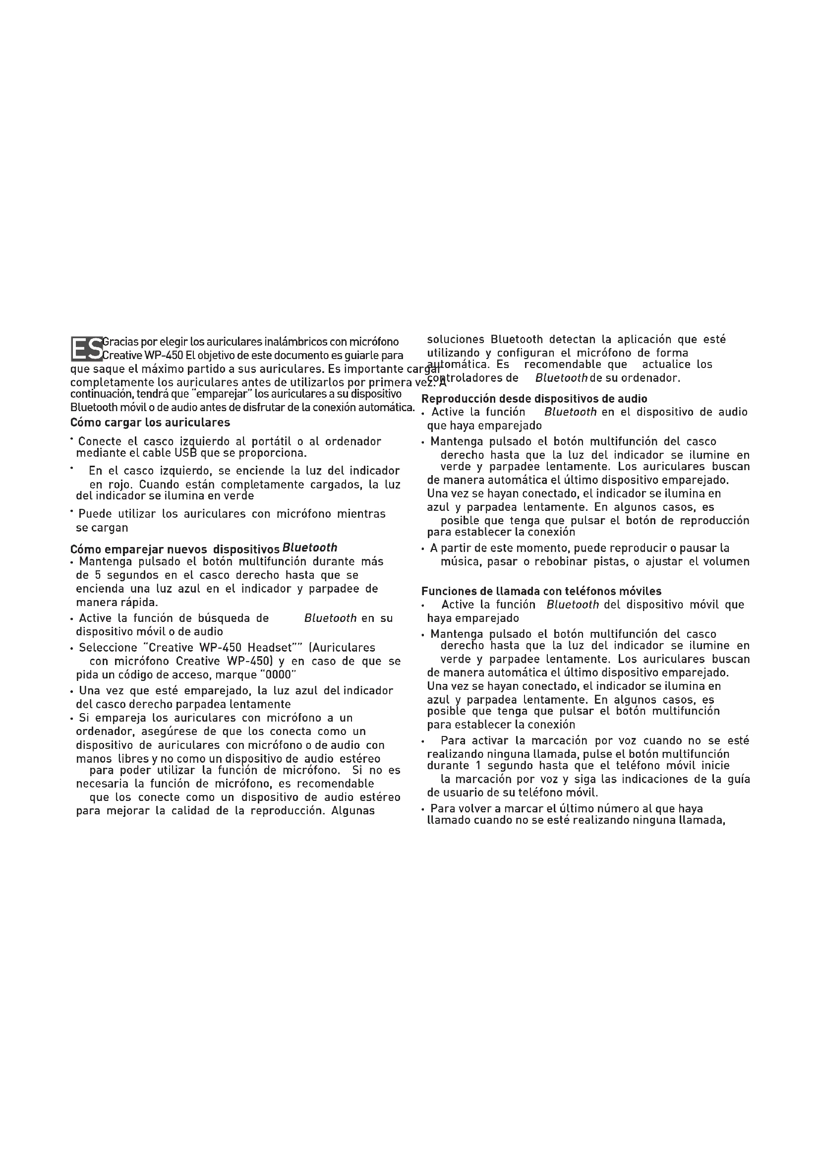 - Mantenga pulsado el botón multifunción durante más de 5 segundos en el casco derecho hasta que se encienda una luz azul en el indicador y parpadee de manera rápida.• Active la función de búsqueda de Bluetooth en su dispositivo móvil o de audio• Seleccione “Creative WP-450 Headset”” (Auriculares con micrófono Creative WP-450) y en caso de que se pida un código de acceso, marque “0000”• Una vez que esté emparejado, la luz azul del indicador del casco derecho parpadea lentamente• Si empareja los auriculares con micrófono a un ordenador, asegúrese de que los conecta como un dispositivo de auriculares con micrófono o de audio con manos libres y no como un dispositivo de audio estéreo para poder utilizar la función de micrófono. Si no es necesaria la función de micrófono, es recomendable que los conecte como un dispositivo de audio estéreo para mejorar la calidad de la reproducción. Algunas soluciones Bluetooth detectan la aplicación que esté utilizando y configuran el micrófono de forma automática. Es recomendable que actualice los controladores de Bluetooth de su ordenador.Reproducción desde dispositivos de audio Active la función Bluetooth en el dispositivo de audio que haya emparejado• Mantenga pulsado el botón multifunción del casco derecho hasta que la luz del indicador se ilumine en verde y parpadee lentamente. Los auriculares buscan de manera automática el último dispositivo emparejado. Una vez se hayan conectado, el indicador se ilumina en azul y parpadea lentamente. En algunos casos, es posible que tenga que pulsar el botón de reproducción para establecer la conexión• A partir de este momento, puede reproducir o pausar la música, pasar o rebobinar pistas, o ajustar el volumen Funciones de llamada con teléfonos móviles• Active la función Bluetooth del dispositivo móvil que haya emparejado• Mantenga pulsado el botón multifunción del casco derecho hasta que la luz del indicador se ilumine en verde y parpadee lentamente. Los auriculares buscan de manera automática el último dispositivo emparejado. Una vez se hayan conectado, el indicador se ilumina en azul y parpadea lentamente. En algunos casos, es posible que tenga que pulsar el botón multifunción para establecer la conexión