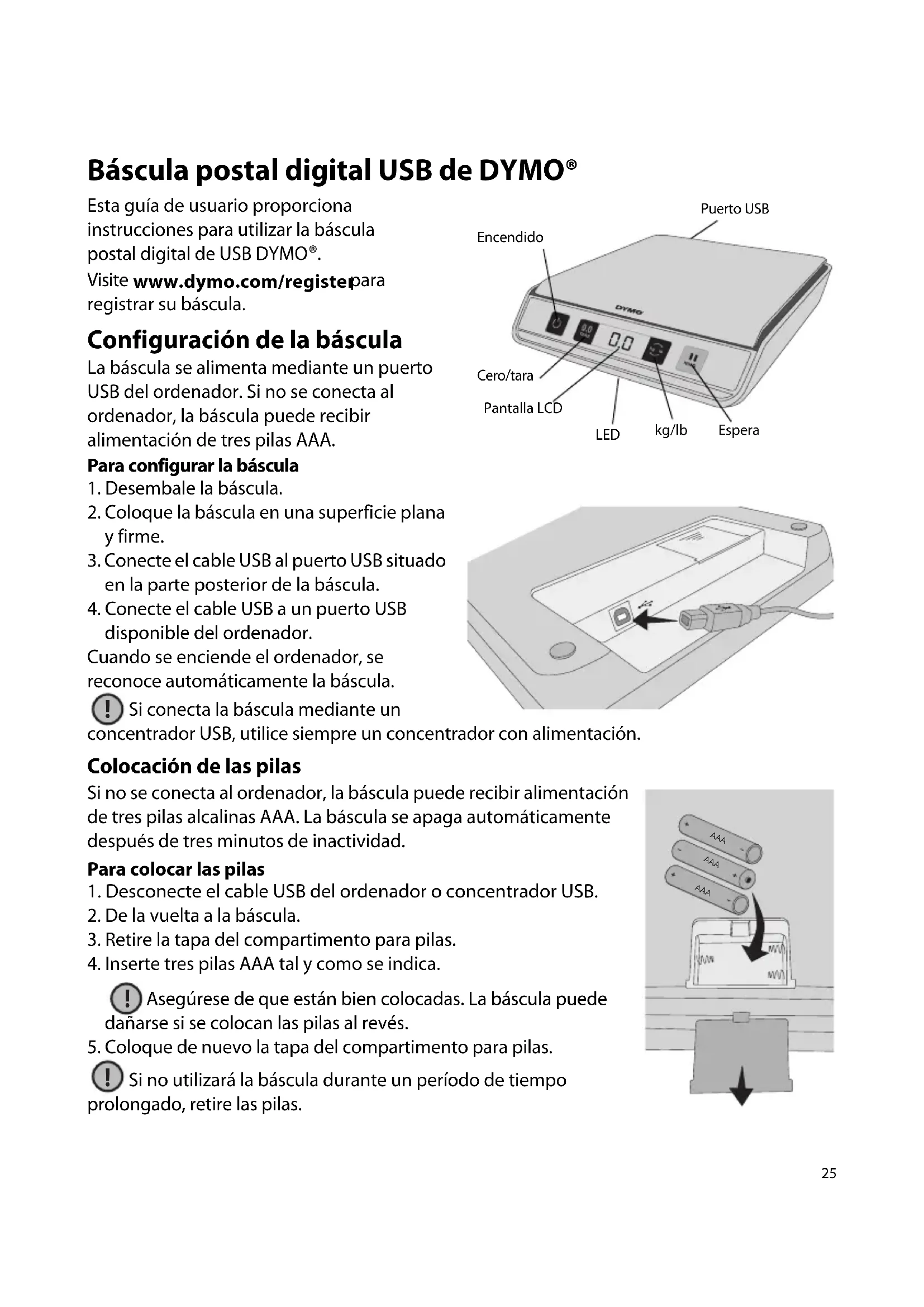 Visite www.dymo.com/register para registrar su báscula. Configuración de la báscula La báscula se alimenta mediante un puerto USB del ordenador. Si no se conecta al ordenador, la báscula puede recibir alimentación de tres pilas AAA. Para configurar la báscula
