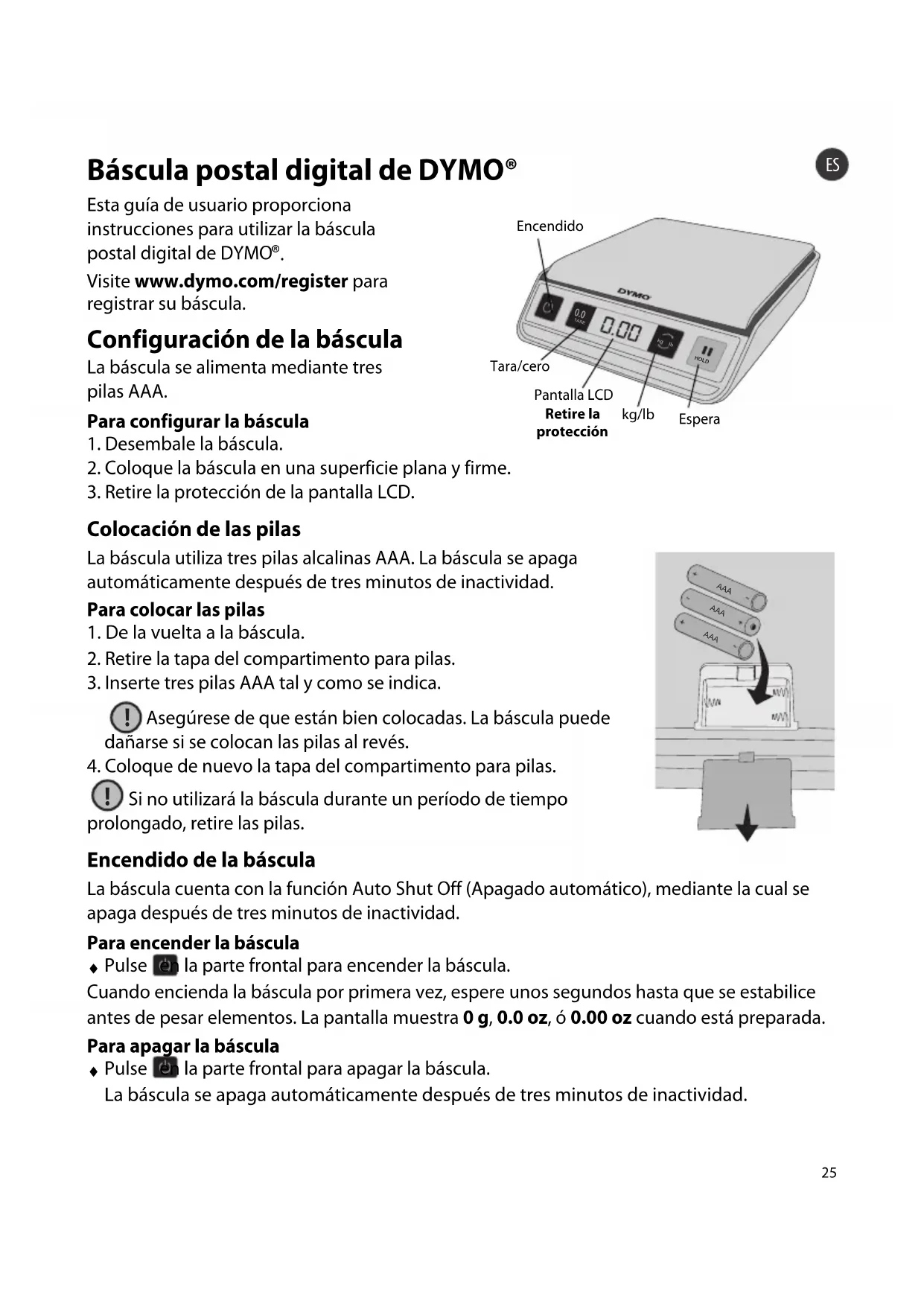 Visite www.dymo.com/register para registrar su báscula. Configuración de la báscula La báscula se alimenta mediante tres pilas AAA. Para configurar la báscula