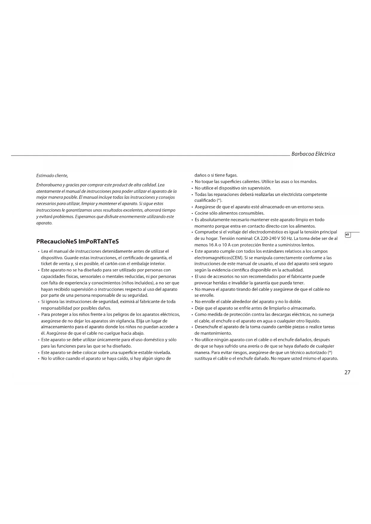 Barbacoa Eléctrica eS30 ANTES DE UTILIZAR EL APARATO POR PRIMERA VEZ