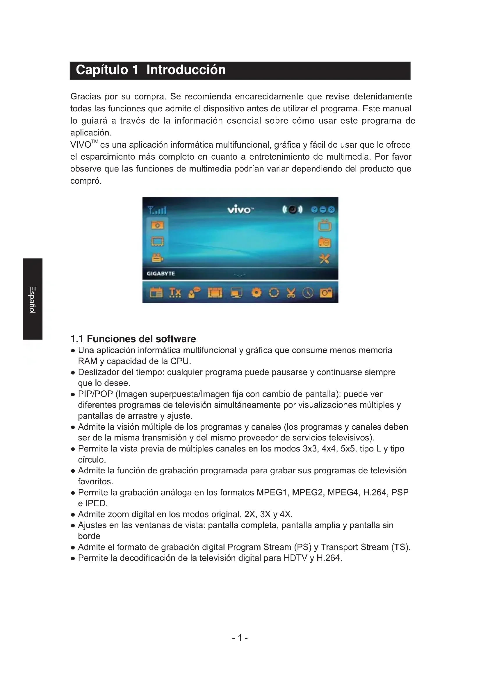 Capítulo 1 Introducción Gracias por su compra. Se recomienda encarecidamente que revise detenidamente todas las funciones que admite el dispositivo antes de utilizar el programa. Este manual lo guiará a través de la información esencial sobre cómo usar este programa de aplicación. VIVO